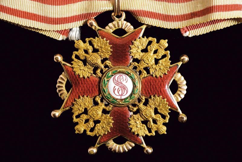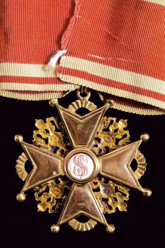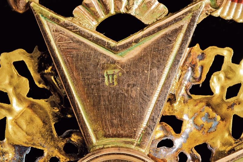 Croce di seconda classe, in oro con smalti. Anello marcato "56". Sul retro due punzoni poco leggibili. Con frammento di nastro.