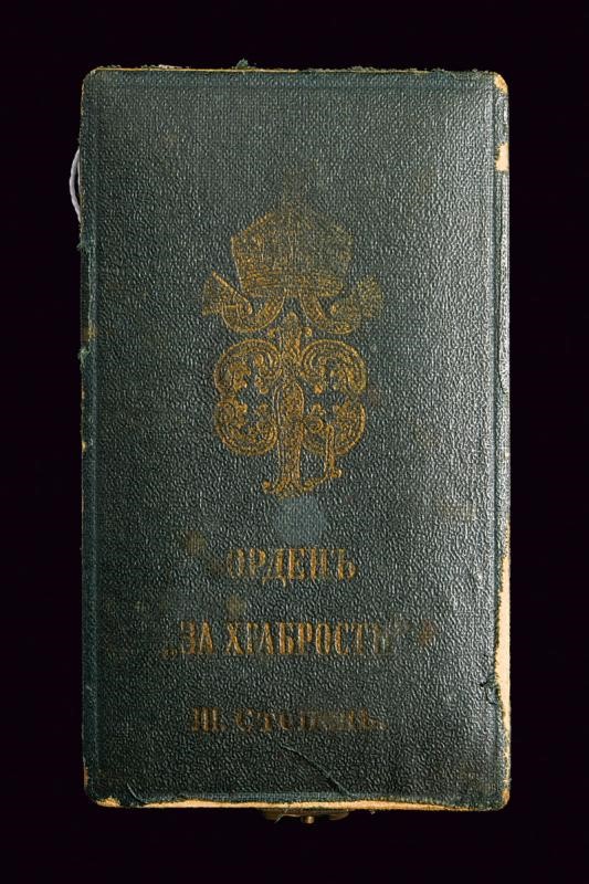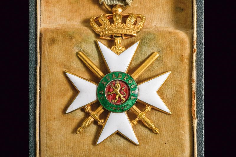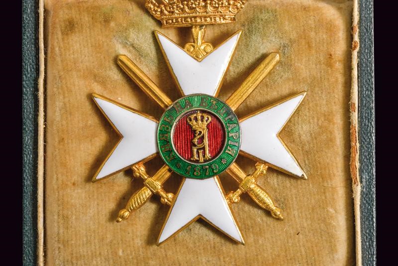 Insegna di terza classe con corona e spade, in metallo dorato e smaltato. Con nastro ed in astuccio originale.