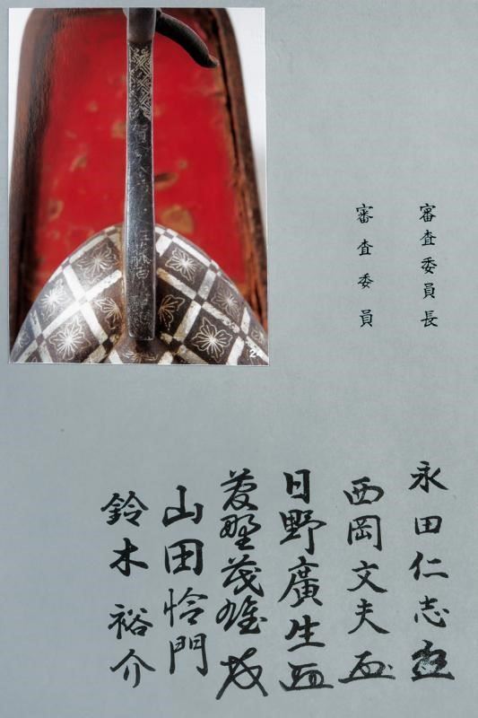 Robusta struttura in ferro con decorazioni in argento sulla superficie finita tetsu_sabiji (nera rugginosa). Recante Iri-hanabishi-koushi (fiori in griglia di losanghe). Recanti anche effigi di Kara-shishi (leoni guardiani cinesi) nell'Hatomune (parte centrale anteriore). Dotati di grandi fibbie di sospensione poste su collo traforato a scala. Sul dorso del collo la firma "Fatto da Kashu-Ju Fushiwara". Finitura e argentatura con segni d'uso e del tempo. La panca con resti di lacca rossa.