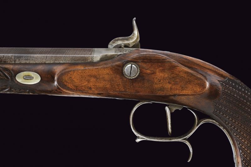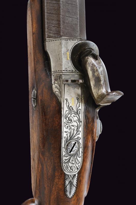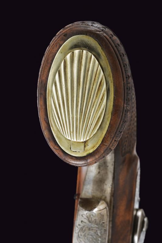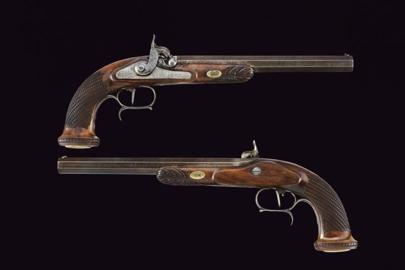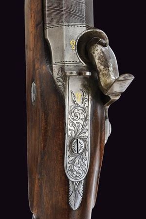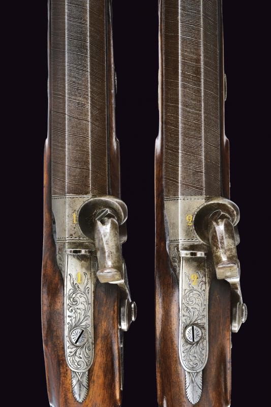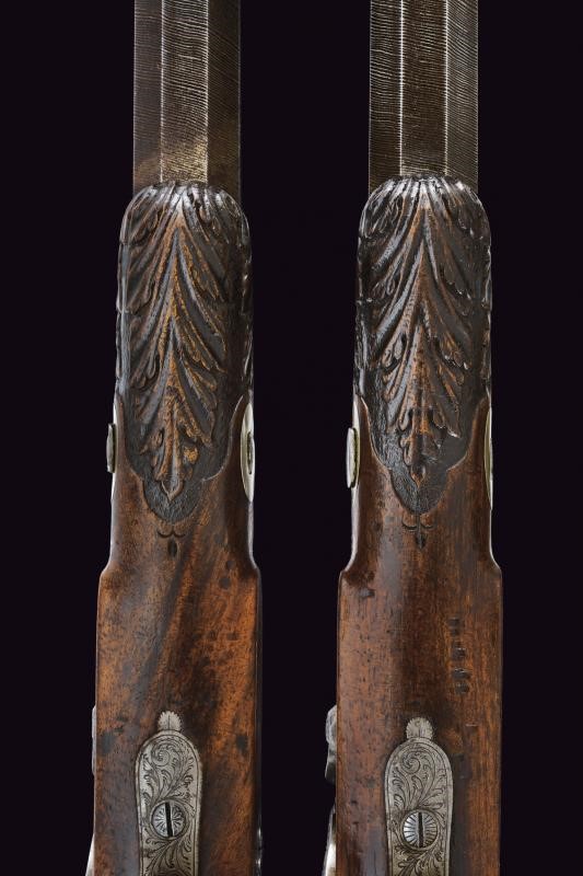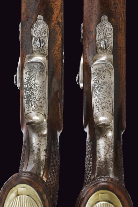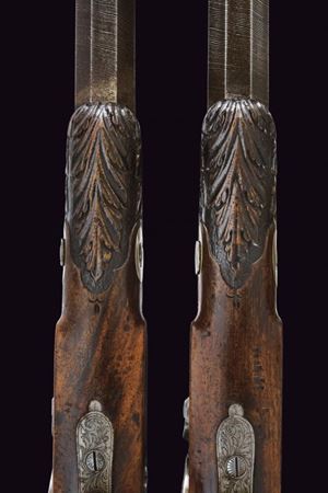 Canne ottagonali rigate lavorate a torcione, punzonate "VC" sul lato inferiore e con resti di punzoni non chiaramente leggibili. Rigature visibili, un po' di patina rugginosa da pulire all'interno. In volata 12,6 mm. I blocchi di culatta con cornicette, pistone dotato di parascintille, e numerati in oro "1" e "2". I codoli incisi a racemi, dotati di alzo fisso e numerati en suite. Batterie a molla in avanti incise a racemi, entrambe ben funzionanti, con due scatti, il primo con sicura al grilletto. I grilletti regolabili (in uno è però mancante la vitina di regolazione). Mezze casse in legno intagliate a fronde di quercia nella parte anteriore e con impugnatura con intagli a bande e quadretti. Cocce con giro di foglie e portacapsule con sportellini in metallo bianco lavorati a conchiglia. Vecchie borre all'interno. Ponticelli in ferro dotati di linguetta poggiadito e incisi a racemi. Coppia da cassetta, quindi prive di alloggiamento per la bacchetta di pulizia.