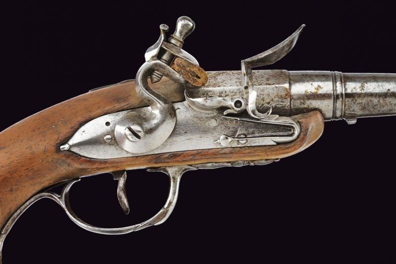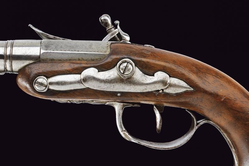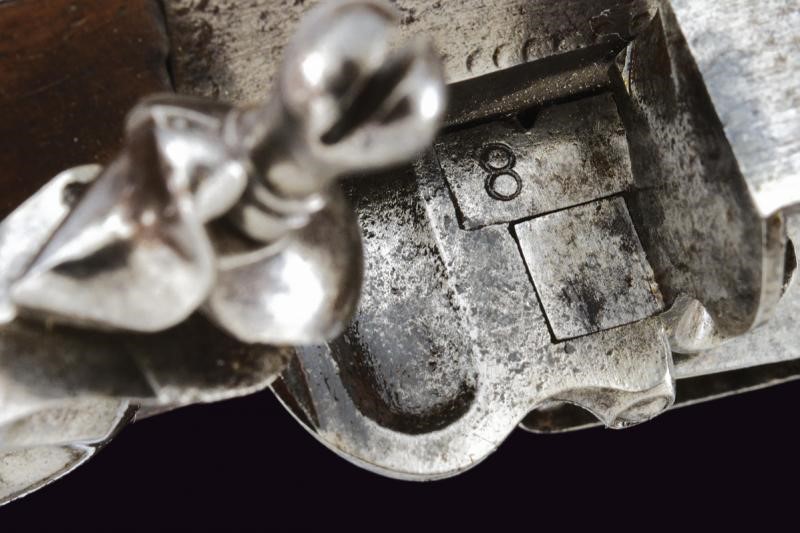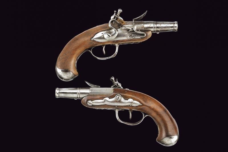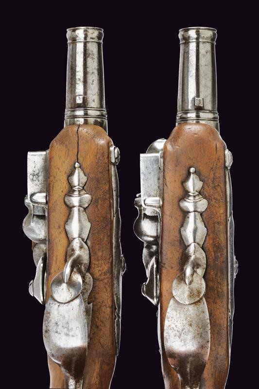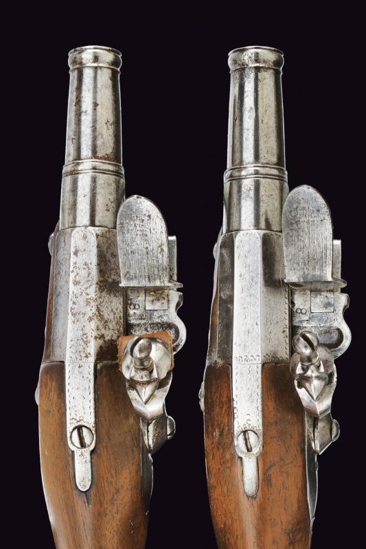Canne lisce a tre ordini, la prima parte ottagonale, in seguito due sezioni tonde, tra la seconda e la terza anellatura al cambio, il blocco tondo svitabile; volate con gioia di bocca; cal. 9 mm. Batterie a pietra focaia con cartelle tondeggianti. Casse a tre quarti in legno (una con crepa nella parte inferiore); fornimenti in ferro, le cocce a becco.