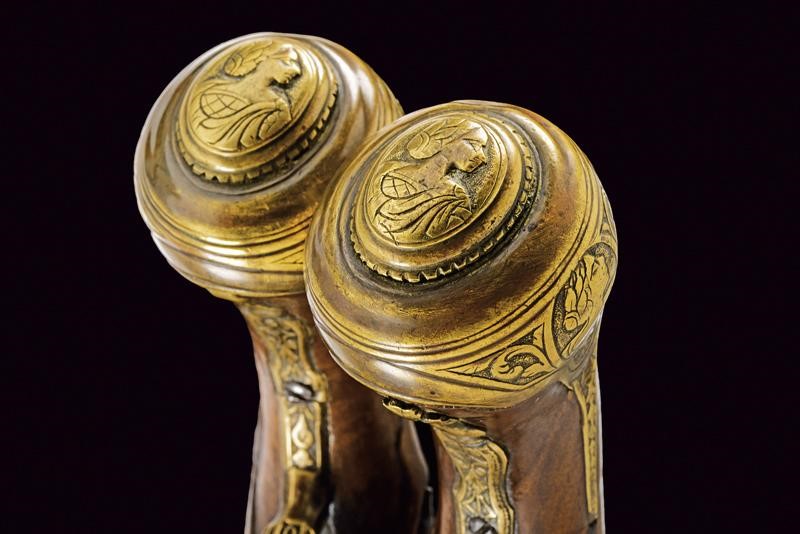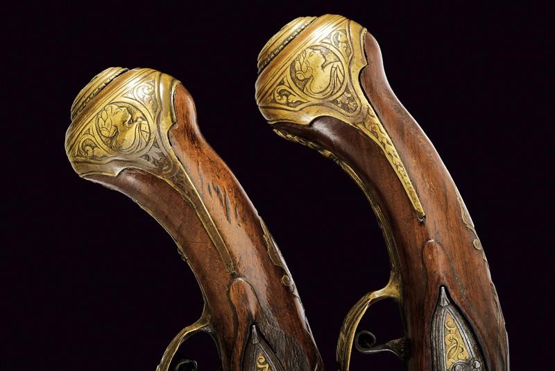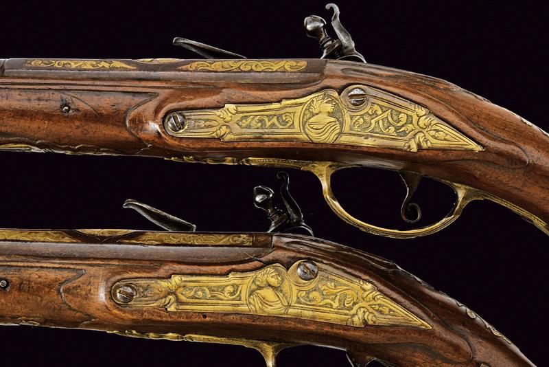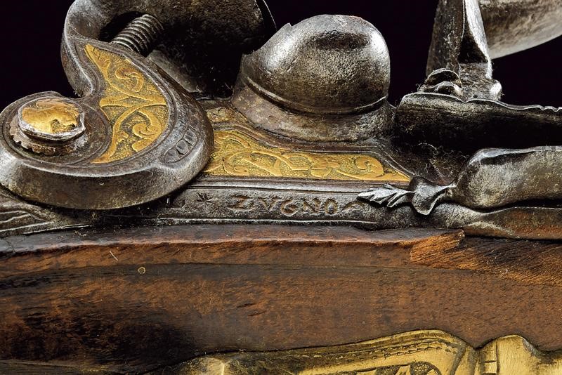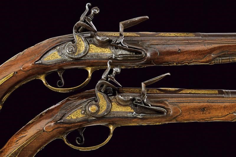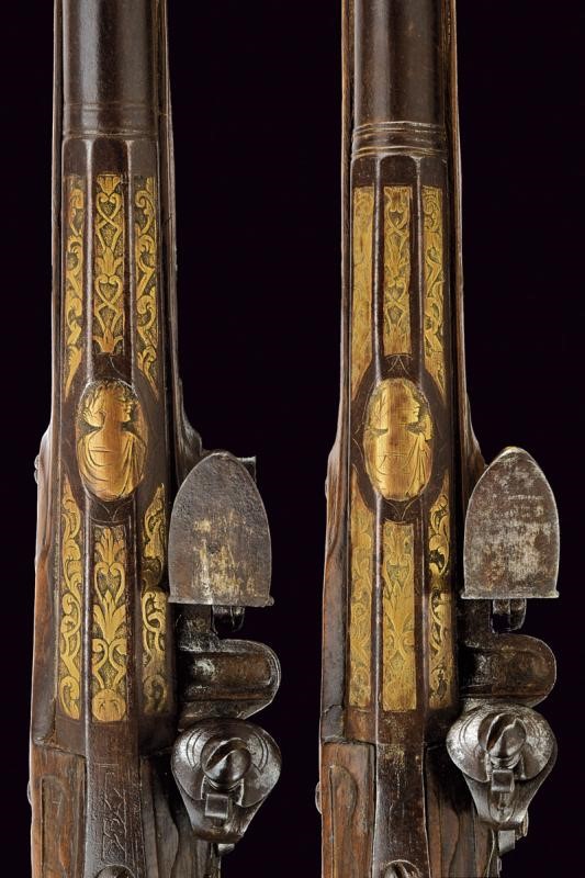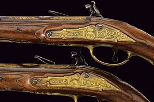 Lunghe canne lisce a due ordini, ottagonali nel primo segmento, le tre facce visibili con decorazioni rimesse in ottone a motivi floreali; al centro un busto femminile, poi un'anellatura, l'ultima sezione tonda, cal. 15 mm. in volata. Codette con resti di incisioni. Batterie a pietra focaia decorate en suite con le canne, i bordi obliqui, firmate "L. ZVGNO". Casse intere in legno (restauri sotto alla canna). Fornimenti in ottone incisi con busti e a motivi floreali. Bacchette in legno.