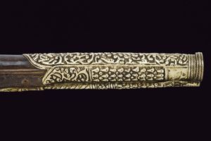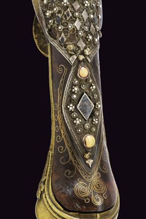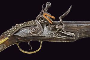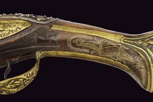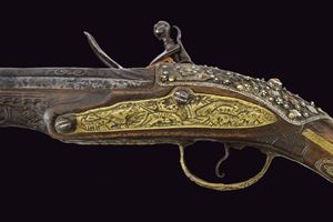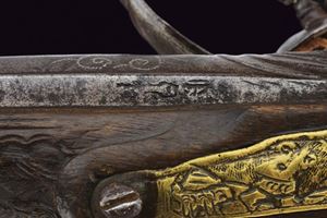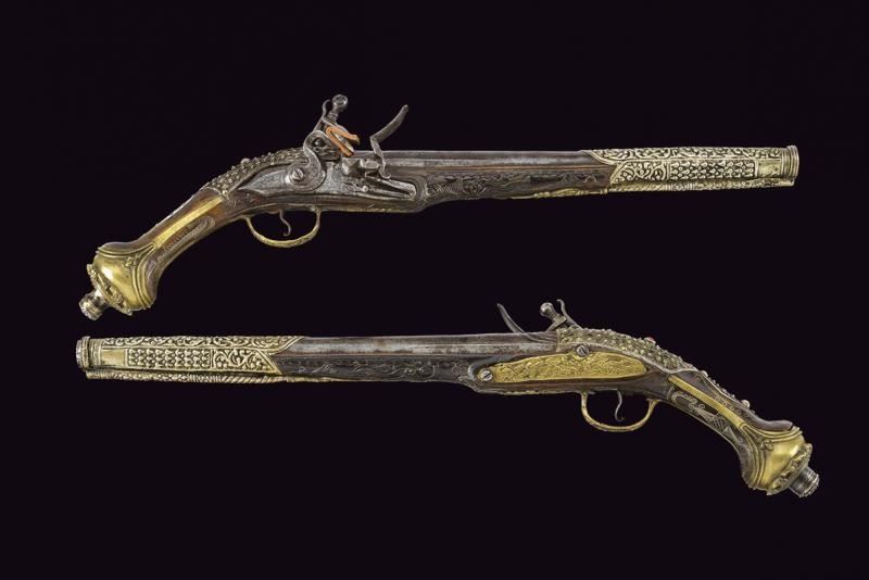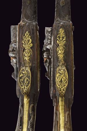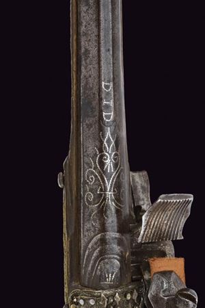 Canne tonde lisce, con culatta decorata con una serie di scanalature circolari, ornate a seguire con decori al damaschino in argento; dotate di bindella con cifre "DID"; cal. 15 mm in volata. Batterie a pietra focaia con cartella tondeggiante, incisa a motivi floreali e con iscrizione non chiaramente leggibile. Casse intere in legno scolpite a onde, adornate da placche in argento. I reggicanna sbalzati a racemi e motivi geometrici, dotati di un anello ingrossato in volata. Le placche al dorso del calcio (due elementi di restauro) con ricche decorazioni in argento in filigrana effigianti rosette, fiori stilizzati (alcuni resti di niellatura) ed impreziosite da pietre dure di colore rosso e bianco (in una mancanze); le codette en suite. Le parti finali dei calci guarnite con filo d'argento. Fornimenti in ottone incisi ed intagliati. Cocce con grosso bottone cilindrico in argento con sommo intagliato a fiore.