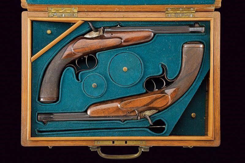 Paio di pistole a retrocarica da tiro di tipo Flobert in cassetta, 1870 circa