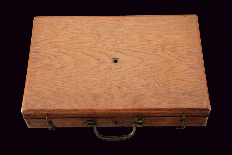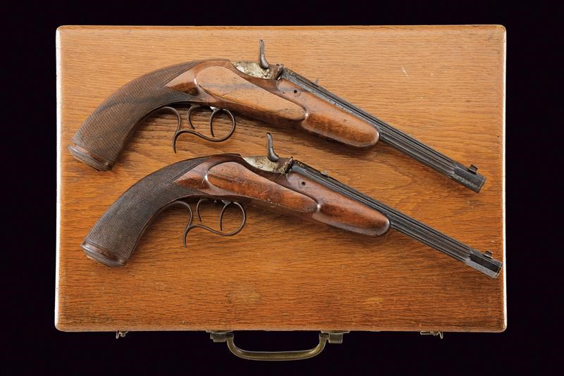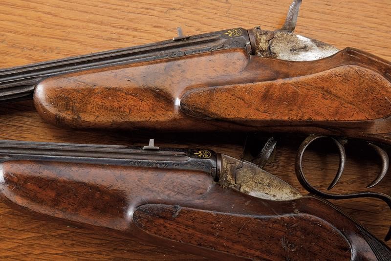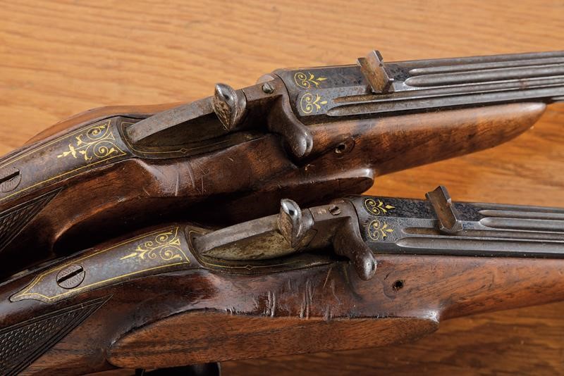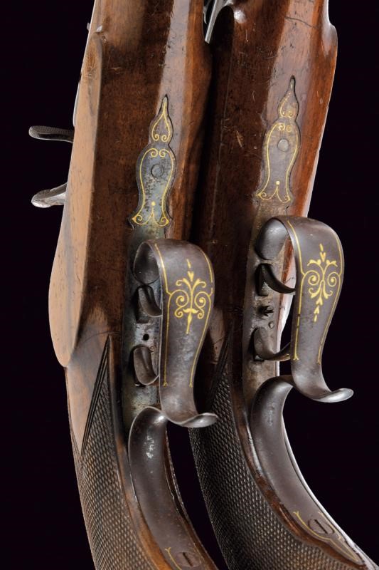 Canne lisce (anime con pitting) ottagonali a tre ordini, la prima parte ottagonale, il centro decorato con sottili scanalature, la volata di nuovo liscia e marcata "R" sotto corona e con matricola "9059", le estremità con decorazioni in oro, le canne con resti di brunitura originale, alzo e mirino, cal. 4 mm; cane posteriore, l'apertura con estrattore automatico. Mezza cassa in legno con calci micro-zigrinati. Fornimenti in ferro brunito e decorato in oro, ponticello con poggiadito, stecher da aggiustate. Nella loro cassetta di legno (danni all'interno) foderata in panno blu.