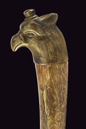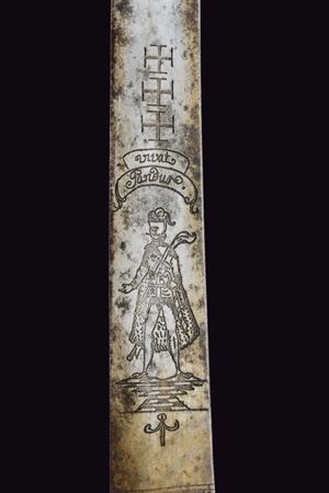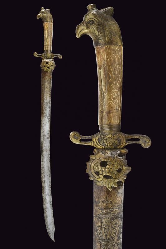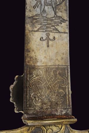 Lama curva a un filo e controfilo, con punta angolata; la base con incisioni effigianti un Pandur, il motto "Viva Pandur" e tre croci. Fornimento in ottone con elementi messi a giorno, pelta con intagli a motivi floreali, massello en suite, elso a bracci controcurvati. Pomo in ottone lavorato a testa d'aquila. Impugnatura in corno (crepe e piccole mancanze).
