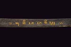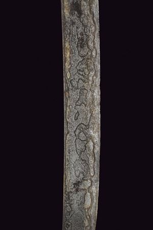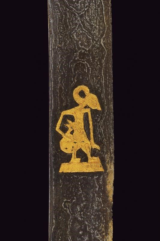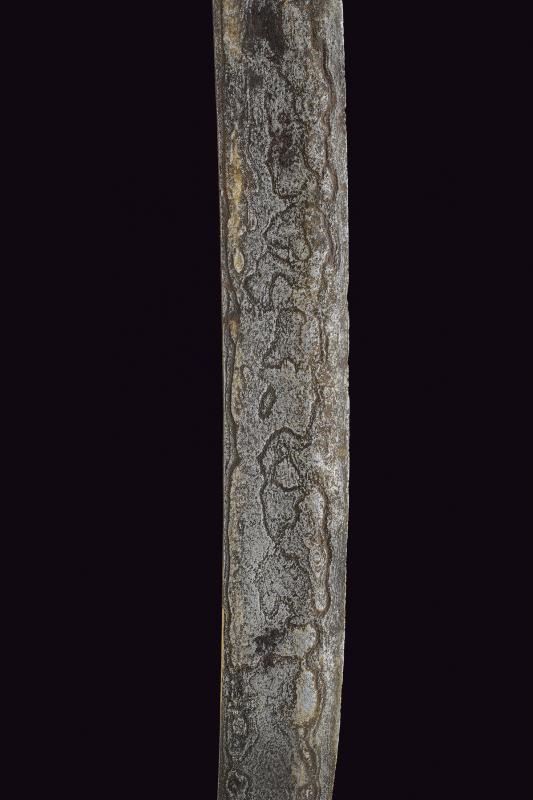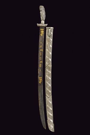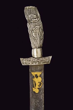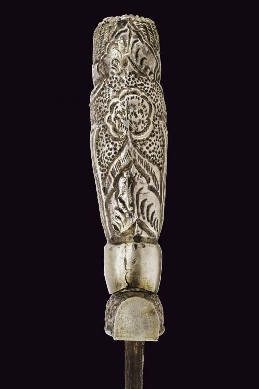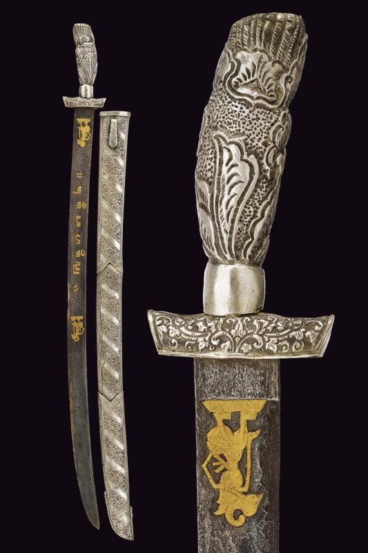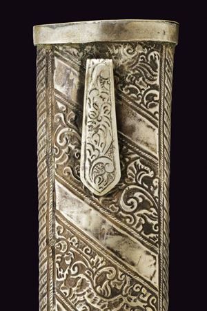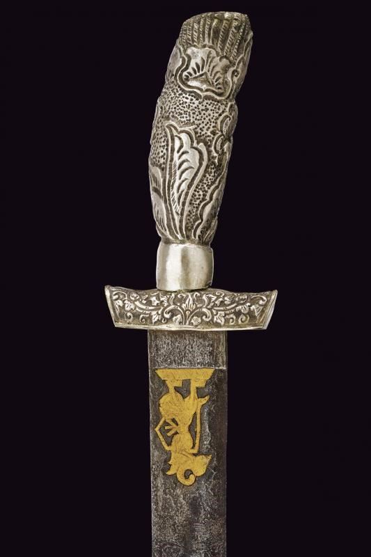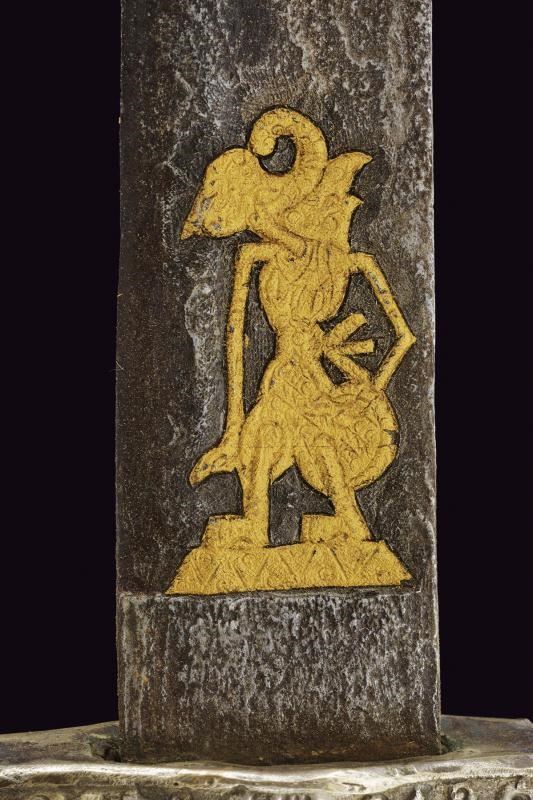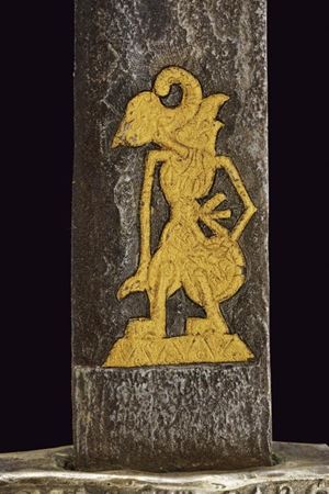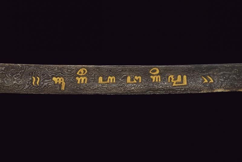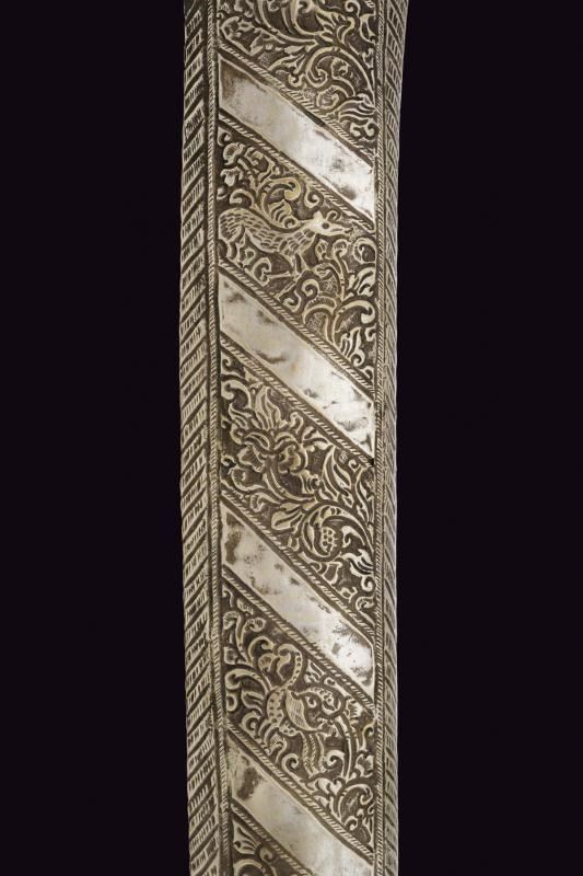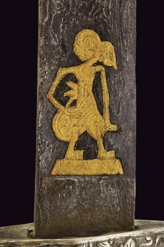 Lunga lama curva in fine pamor, a un filo e breve controfilo, lievemente sgusciata. Recante nella prima metà incisioni dorate su entrambe le facce. Con una iscrizione in caratteri giavanesi intagliati e leggermente rilevati. La scritta posta fra due personaggi con la tipica silouette delle marionette Wayang tradizionali. La doratura ben conservata, con minime mancanze. Segni d'uso e del tempo alla lama. Il fornimento in metallo color argento (argentone?) L'elso in lamina decorata in rilievo a motivi floreali. La ghiera liscia, l'impugnatura decorata a grandi foglie in rilievo su fondo a granuli. Fodero in legno rivestito con lamine sempre in metallo color argento, decorati a bande alternate liscie e decorate a motivi floreali. Gancio da cintura anche questo decorato. Raro in dimensioni così importanti e con lama decorata in questo modo.