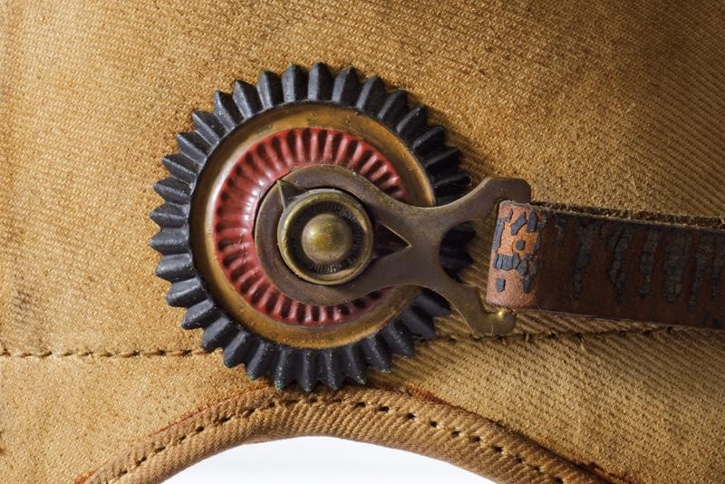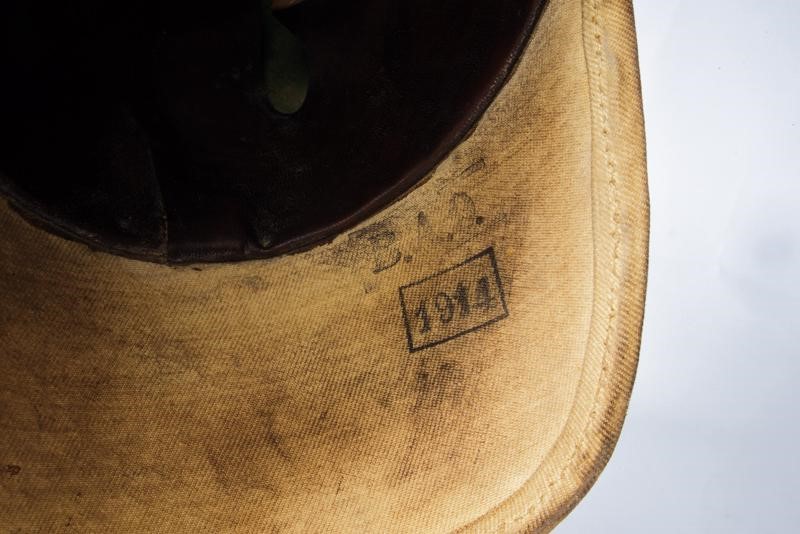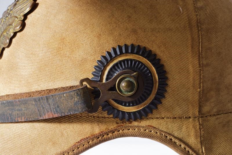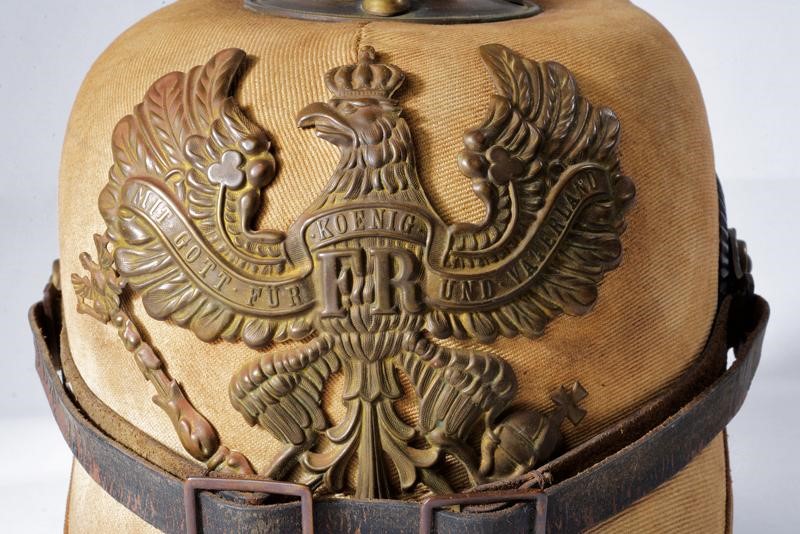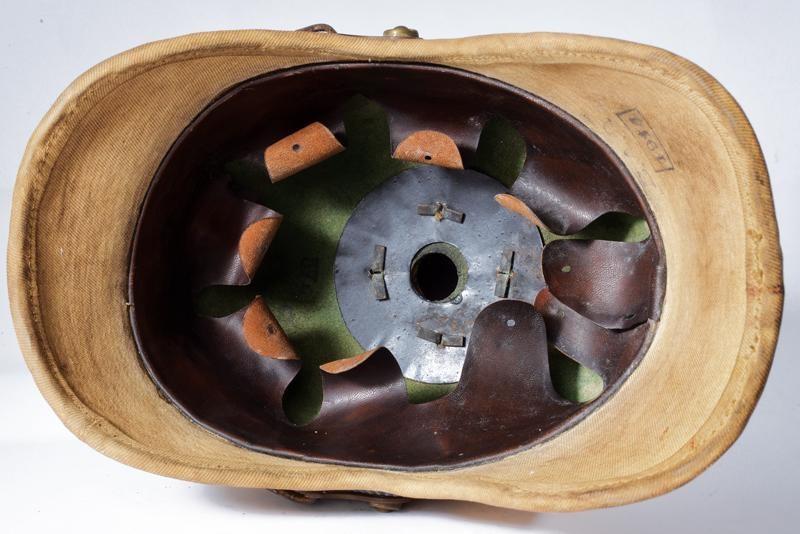 Coppo di struttura semirigida rivestito in tessuto color sabbia (macchie, segni s'uso e del tempo). Fregio anteriore ad aquila in metallo color bronzo con tracce di doratura. Il puntale lavorato allo stesso modo, su base a disco. Due coccarde. Soggoli in cuoio anche questi con segni d'uso e del tempo. Interno con timbri "1914" e "B.A.O.". Cuffia in alluda ben conservata all'interno. Presenti la coccarda prussiana e quella di grado. Probabilmente per le forze di spedizione in Cina.