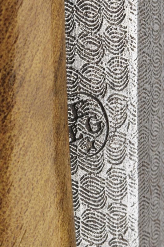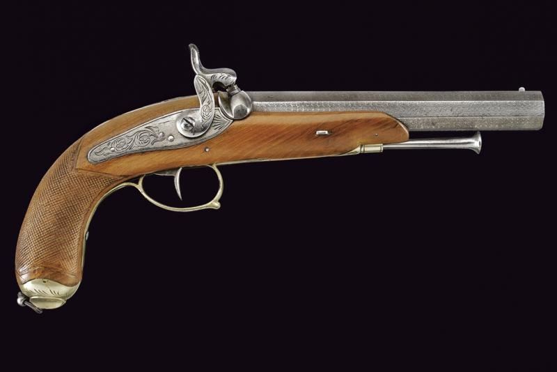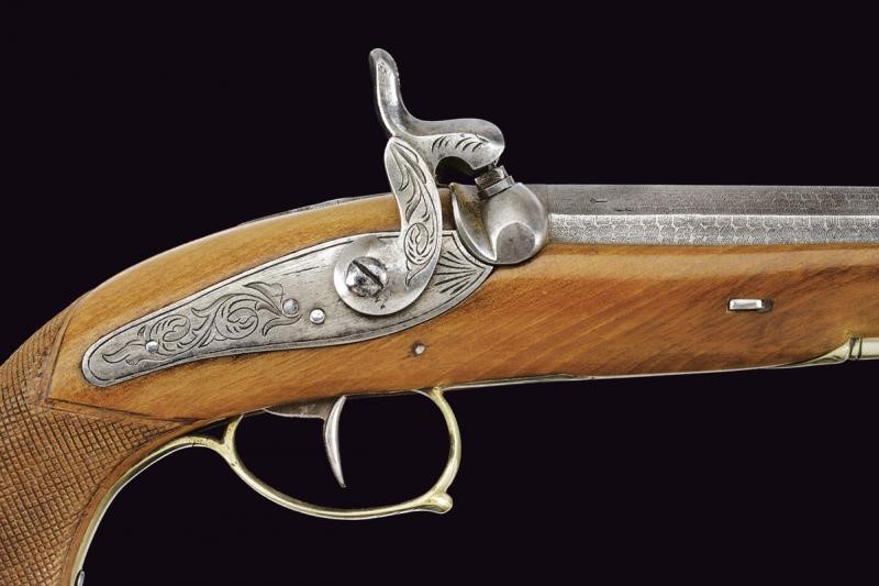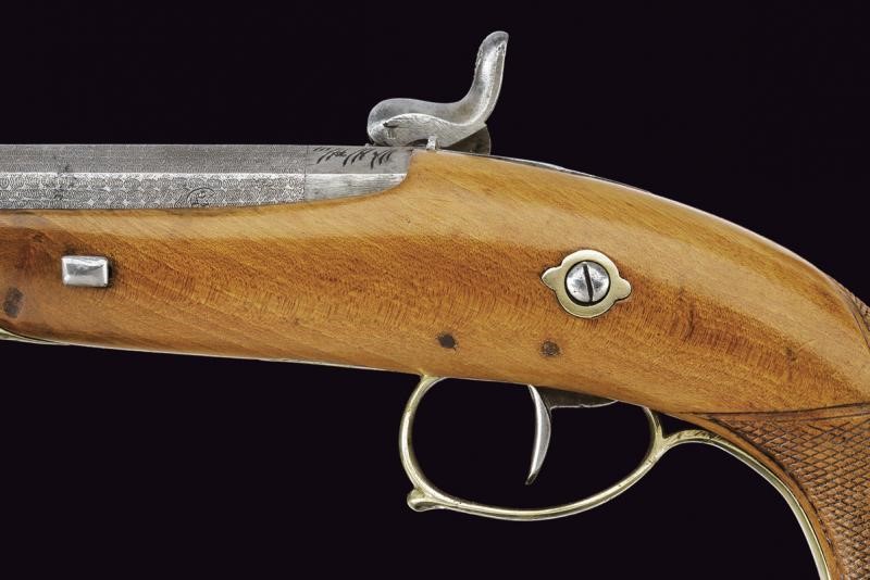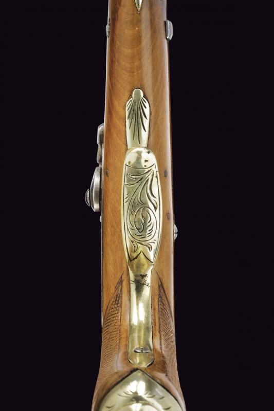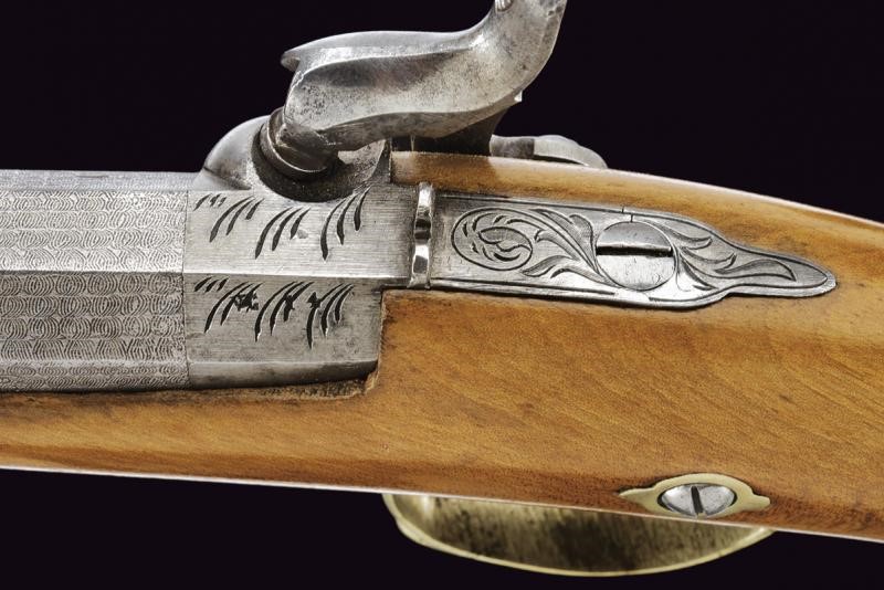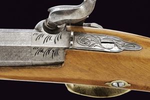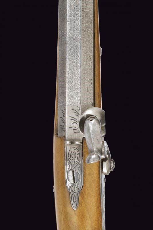 Canna ottagonale rigata, completamente decorata con trama damascata, la base liscia, con incisioni, sul lato sinistro punzone del banco di prova di Liegi; mirino in volata, cal. 14.8 mm. Codetta incisa a motivi floreali e munita di alzo. Batteria a luminello a molla indietro con cartella incisa en suite. Mezza cassa in legno con calcio zigrinato. Fornimenti in metallo giallo decorati nello stesso modo. Bacchetta in ferro. Anello porta correggiolo.