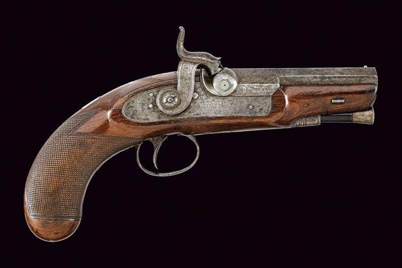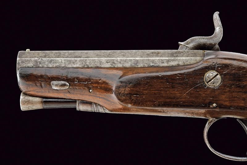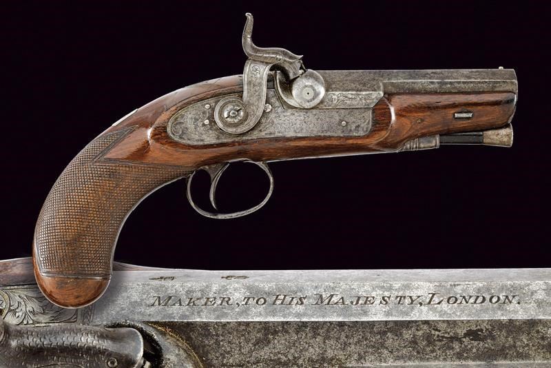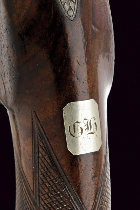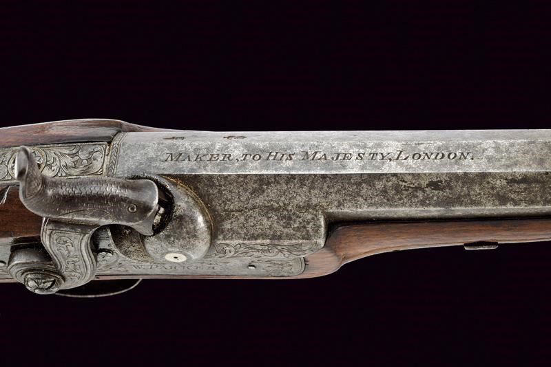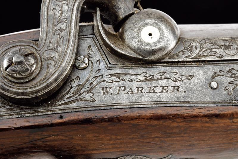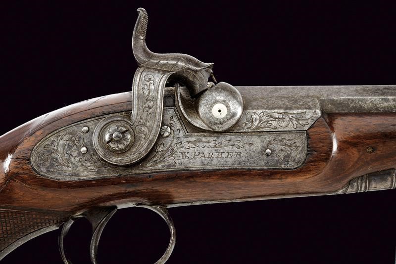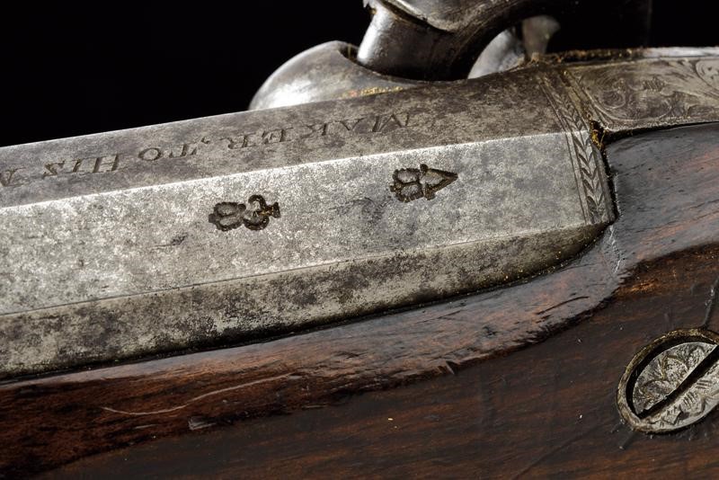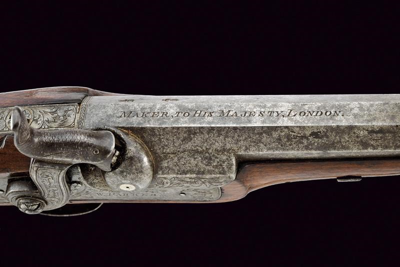 Canna ottagonale, liscia, con due punzoni britannici alla base, marcata al dorso "MAKER, TO HIS MAJESTY, LONDON"; mirino in volata, cal. 12 mm. Codetta incisa. Batteria a molla in avanti, cartella piatta ed incisa a motivi fitomorfi, firmata "W. PARKER". Cassa intera in legno, il calcio zigrinato; fornimenti in ferro incisi en suite. Sul collo monogramma con cifre. Bacchetta in legno con battipalla e cavastracci in ferro.