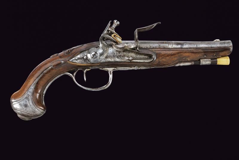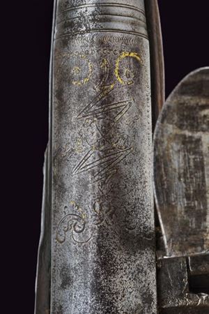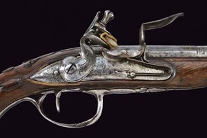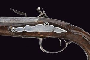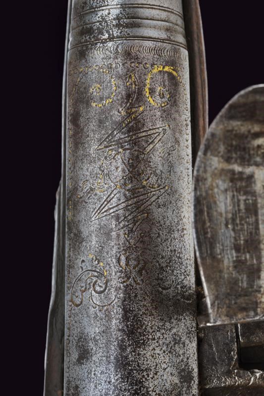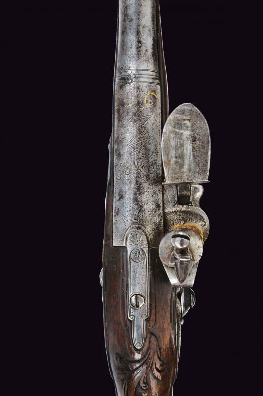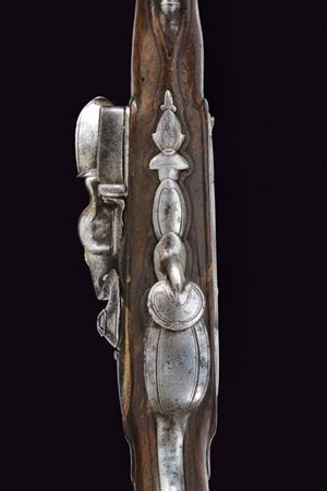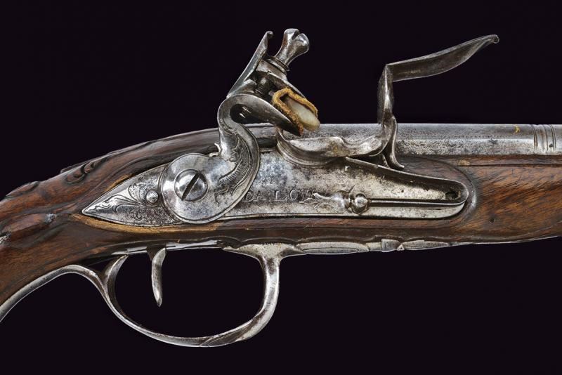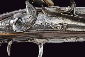 Canna liscia a due ordini, con resti di incisioni e doratura, mirino, cal. 13 mm; batteria marcata "DA LOW" e leggermente incisa a motivi floreali; cassa intera in legno scolpita a motivi floreali, fornimenti in ferro delineati ai bordi. Bacchetta in legno con battipalla in osso.