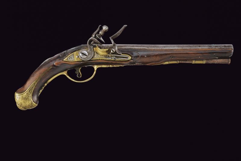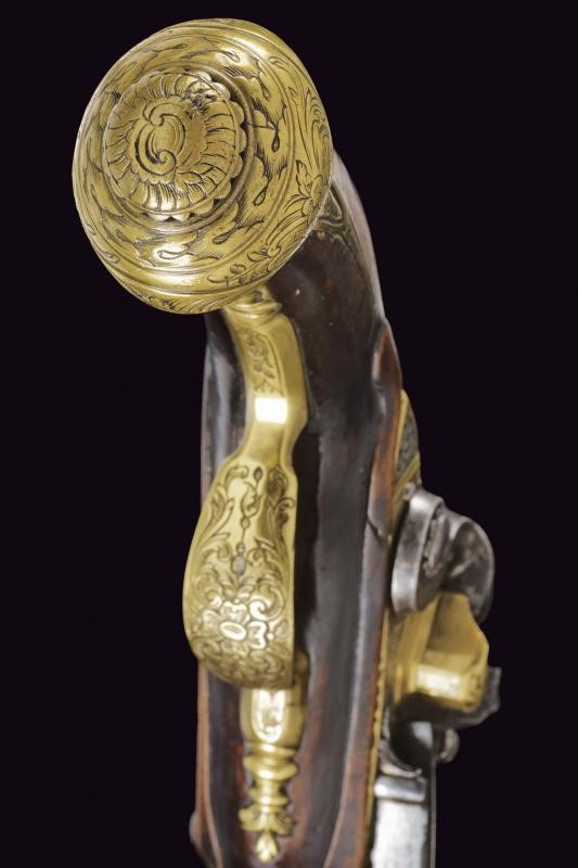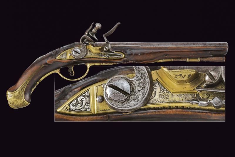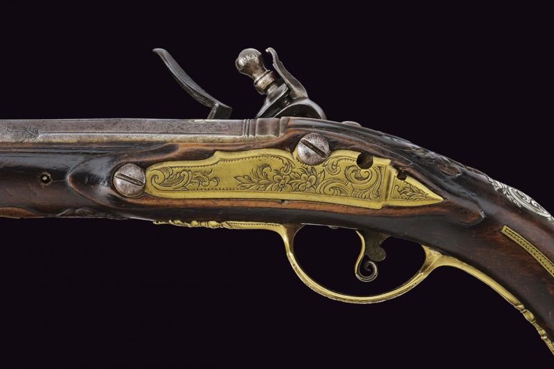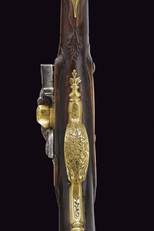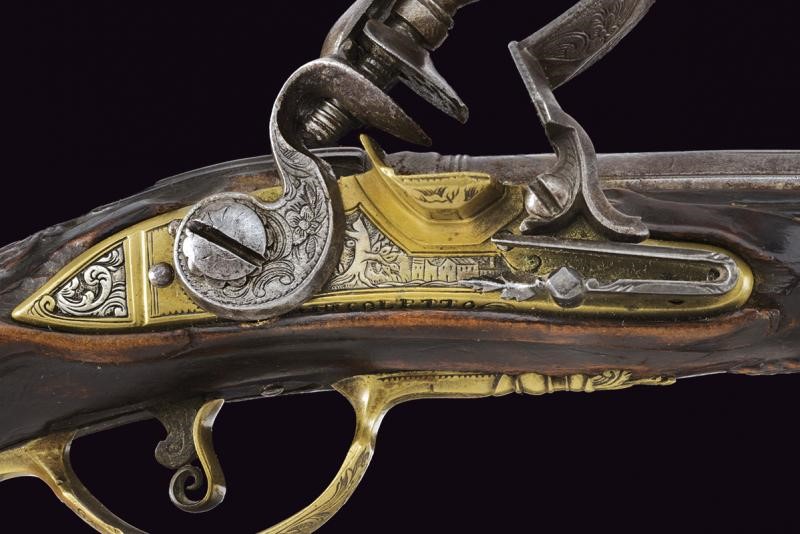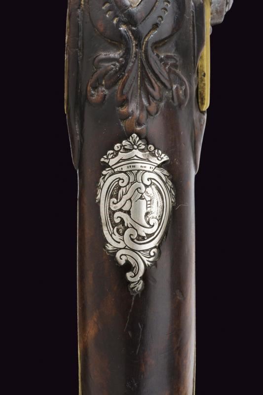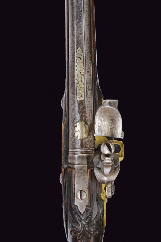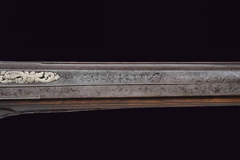 Canna liscia, tonda, con culatta ottagonale decorata con agemine in argento; sulla bindella la firma "NICOLETTO", cal. 10 mm in volata; codetta incisa. Batteria in ottone, firmata al bordo "P. NICOLETTO", decorata con placche in lamina d'argento incise con raffigurazioni di edifici e a motivi floreali. Il cane inciso. Cassa intera in legno, leggermente scolpita, dotata di fornimenti in ottone finemente incisi a motivi floreali; sul dorso scudetto in argento con busto sormontato da corona. Bacchetta sostituita.