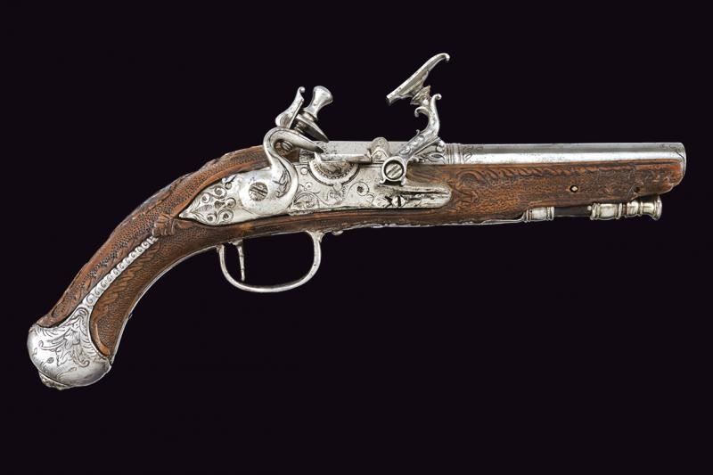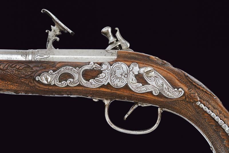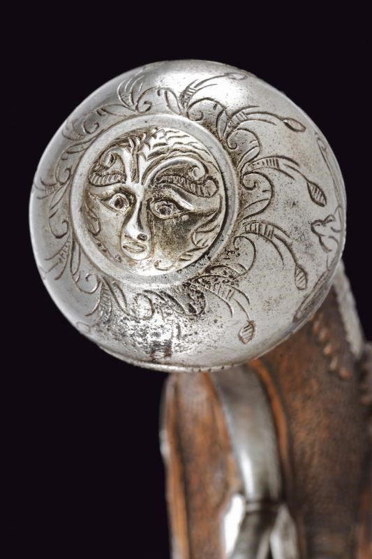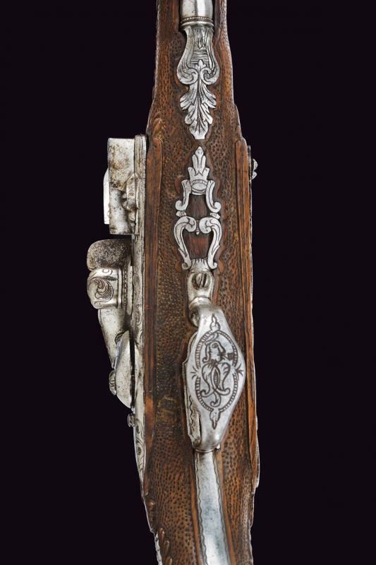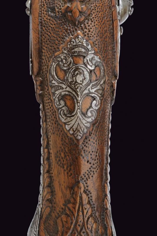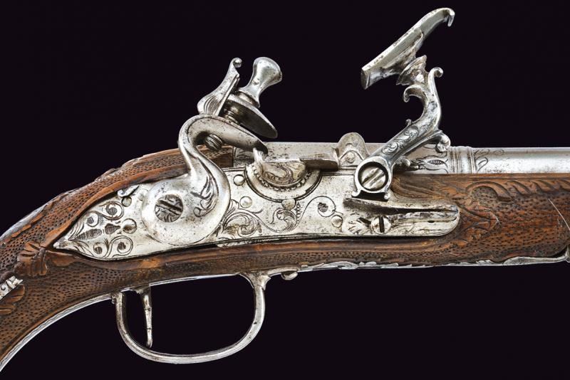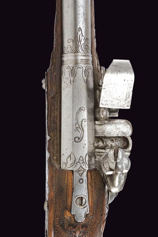 Canna liscia a due ordini, la prima parte ottagonale, in seguito, dopo anellature, di sezione tonda; entrambi i segmenti con incisioni alle estremità a motivi geometrici; in cal. 12 mm. Batteria a pietra focaia alla fiorentina, cartella, cane e collo della martellina incisi a volute; copriscodellino a scatto. Cassa intera in legno completamente decorata con puntini, i bordi lievemente scolpiti a cornice. Fornimenti in ferro, contropiastra incisa e traforata a volute e volti; il ponticello decorato en suite; coccia con codoli sagomati e con medaglione centrale recante mascherone in rilievo. Bacchetta in legno (rottura) con battipalla in ferro strutturato a balaustro.