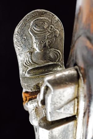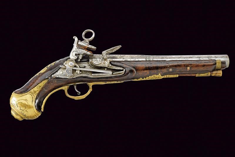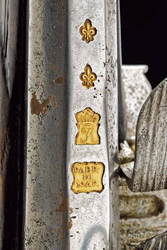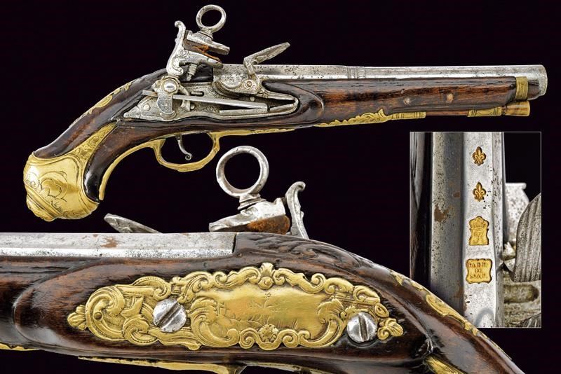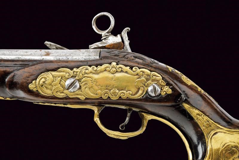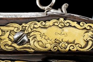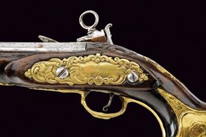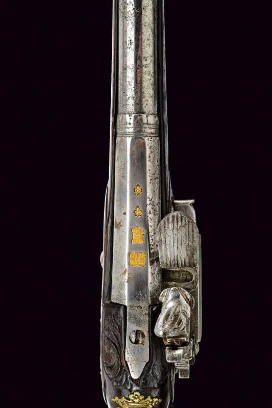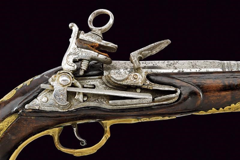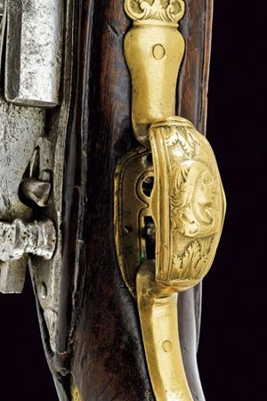 Canna liscia a due ordini, ottagonale e tonda, con anellature e cornice al cambio, recante marca del Real fabbrica di Napoli sovrastata da due gigli, il tutto rimesso in oro; cal. 17.8 mm. Batteria a pietra focaia, piccoli difetti generali, la martellina con volto muliebre in bassorilievo. Cassa intera in legno, la parte attorno alla codetta scolpita. Fornimenti in ottone, ponticello con intagli floreali e volto muliebre, contropiastra quasi totalmente incisa ed intagliata a volute e racemi, bello scudetto al dorso e grossa coccia con mascherone in rilievo. Bacchetta in legno con battipalla in corno e cavastracci in ferro. Segni d'uso e del tempo.