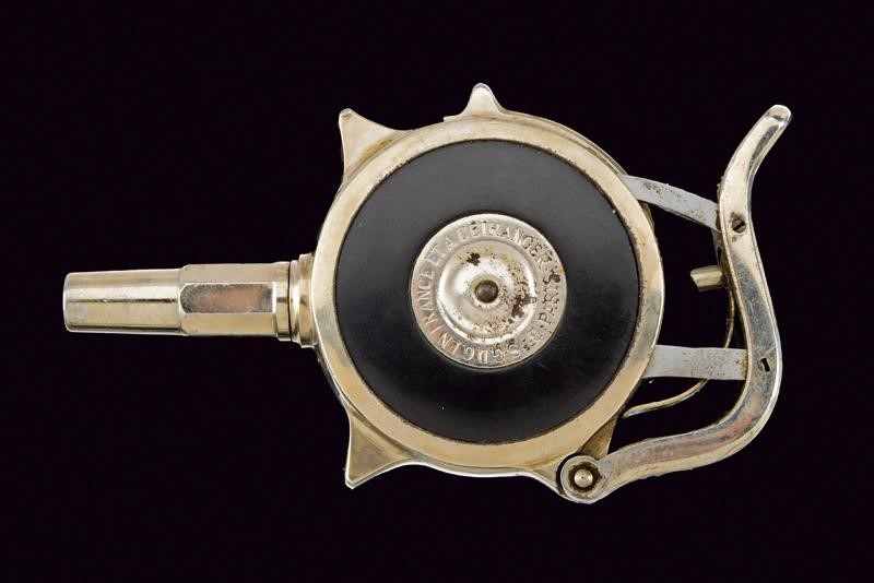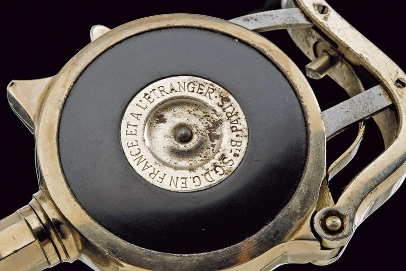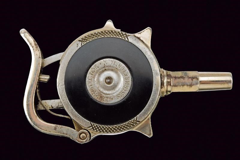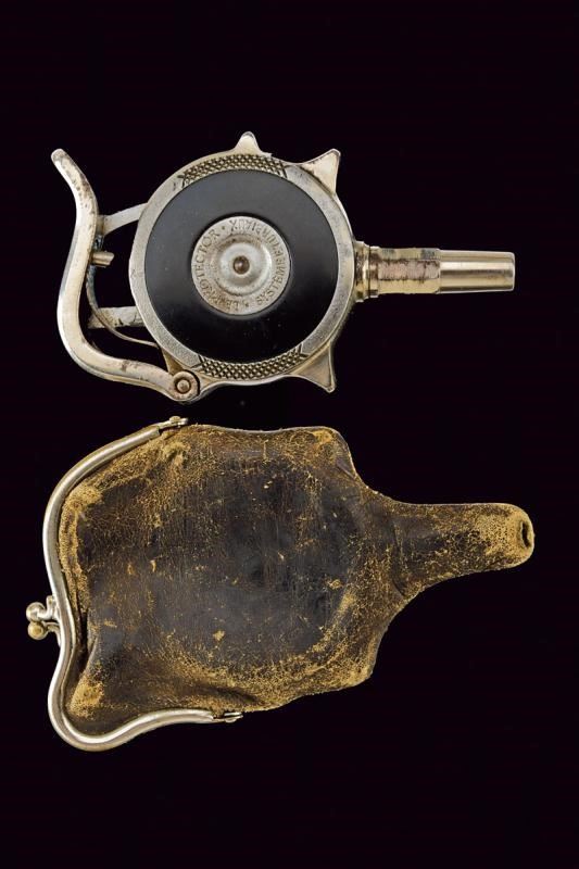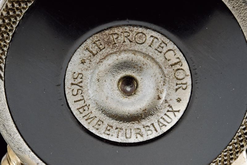 Con breve canna ottagonale e tonda; castello di forma circolare marcato su un lato "LE PROTECTOR SYSTEME E. TURBIAUX", sull'altro "B.te S.G.D.G. EN FRANCE ET A L'ETRANGER - PARIS", con guancette a disco di colore nero. Sicura esterna. Meccanica funzionante. Nichelata (piccole mancanze alla finitura). All'interno matricola "P 2xx" e due punzoni. Completa del suo astuccio originale in pelle (forti segni d'uso e del tempo) con chiusura in metallo bianco. Modello di piccole dimensioni in cal 5.5 mm (la maggior parte della produzione era in calibro 7 mm), molto rara.