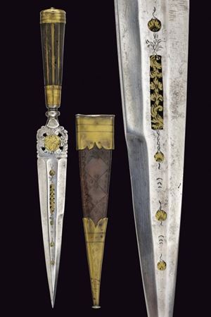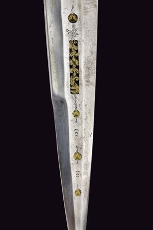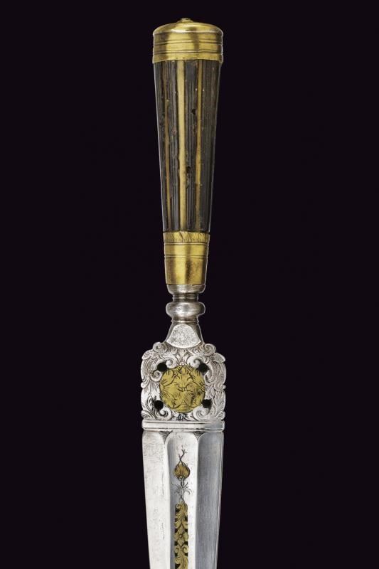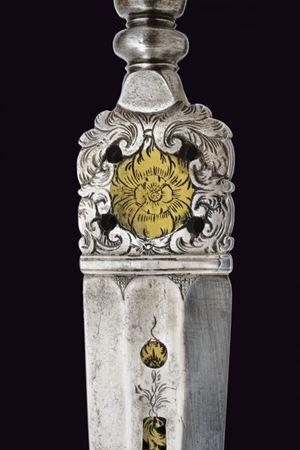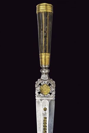 Lama dritta, triangolare, a un filo e controfilo, di sezione esagonale con la facce dorsali incise, parzialmente traforate e rimesse in ottone a motivi floreali; tallone messo a giorno e lavorato en suite. Nodo a disco. Impugnatura in corno (mancanze) con bande longitudinali. Ghiera e cappellotto in ottone. Completo di fodero in cuoio con fornimenti in ottone.