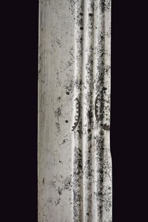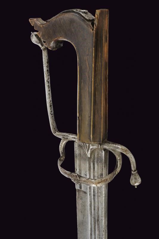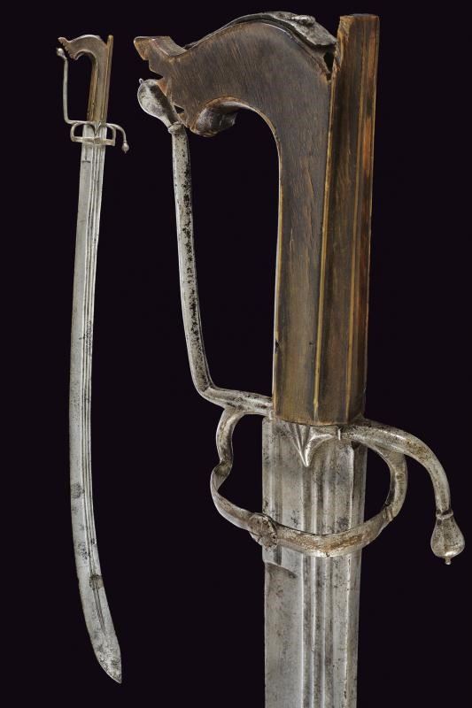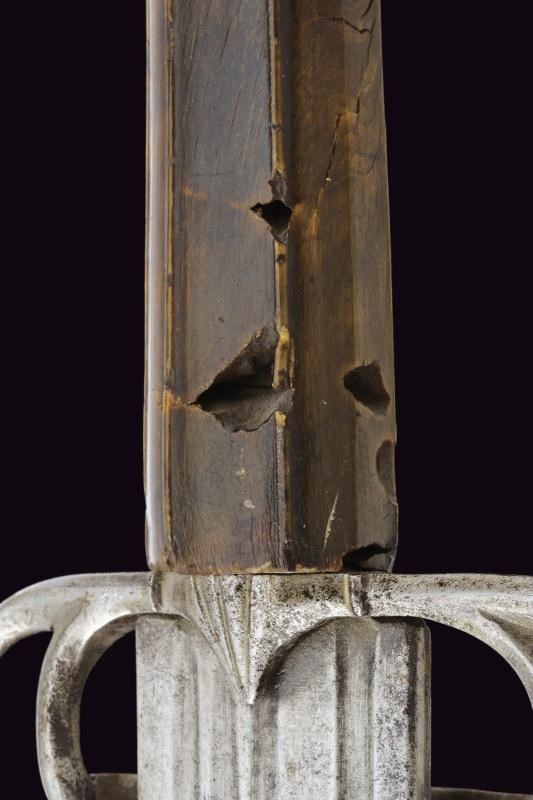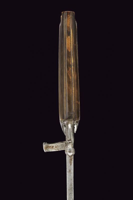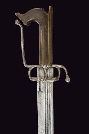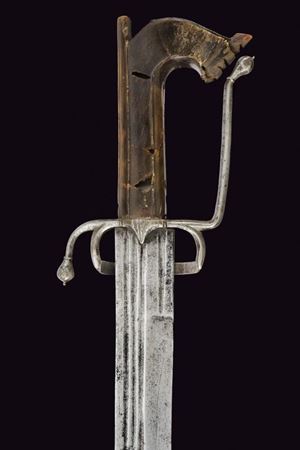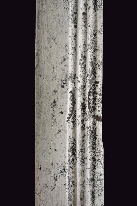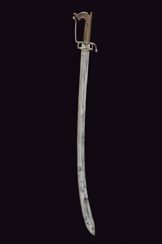 Larga e robusta lama curva a un filo e controfilo con triplice scanalatura, al tallone anche una quarta scanalatura. Sul lato di quarta due semicerchi dentati. Fornimento di foggia europea in ferro con sottoponte su due archi, intagliato con una rosetta al centro, braccio dell'elso incurvato verso la lama e ramo di guardia con estremità a pera faccettata. Massello appuntito e scanalato. Impugnatura in corno scolpito (mancanze).