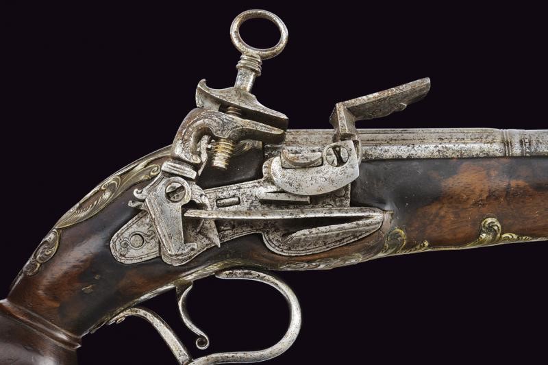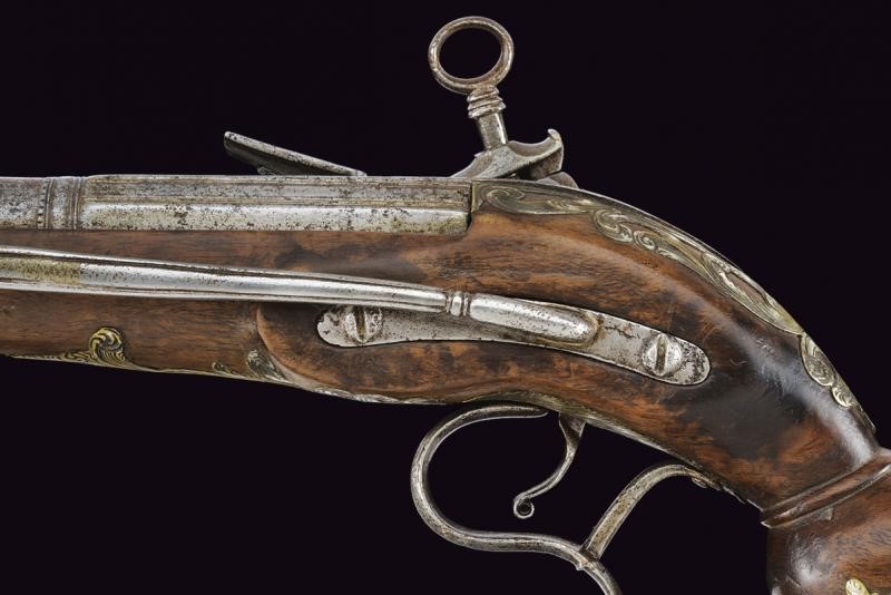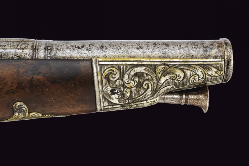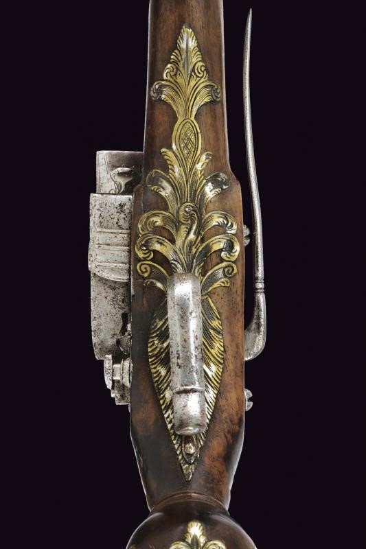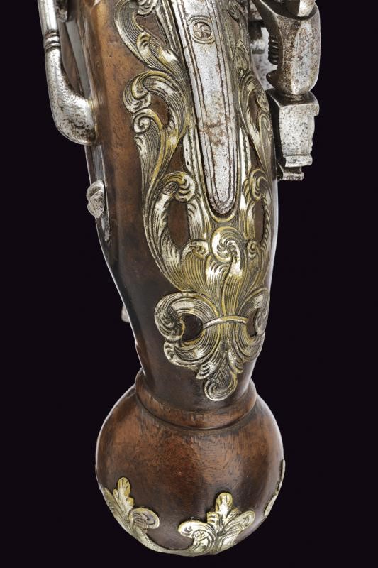 Canna liscia a due ordini, la prima parte ottagonale, ognuna delle facce decorata con sottili coppie di scanalature, al cambio anellature, una a due fasce, una liscia e l'altra perlinata; la seconda parte tonda con gioia di bocca, in cal.17 mm; codetta curva con bordi incisi. Batteria alla micheletta, anche in questo caso incisa ai bordi. Cassa in legno con tipico pomo sferico. Fornimenti in ottone argentato (alcune mancanze) parzialmente traforati, incisi e intagliati a motivi floreali, ponticello con poggiadito. Gancio da cintura e bacchetta in ferro.