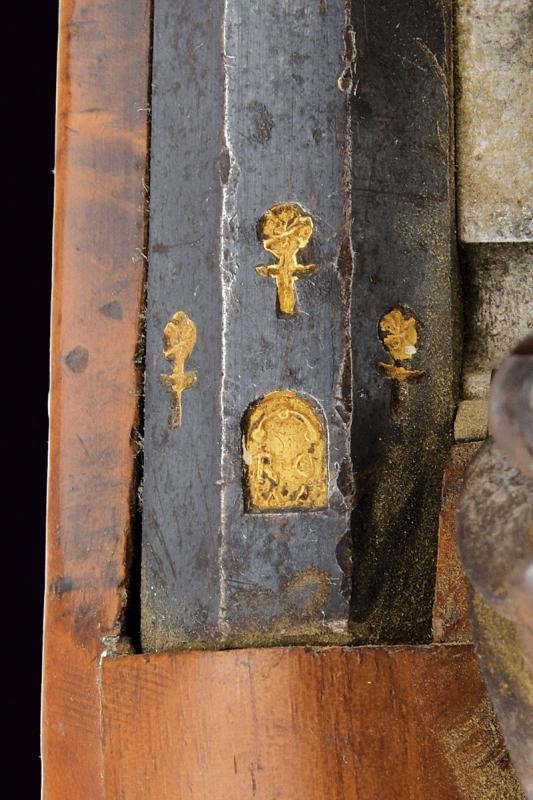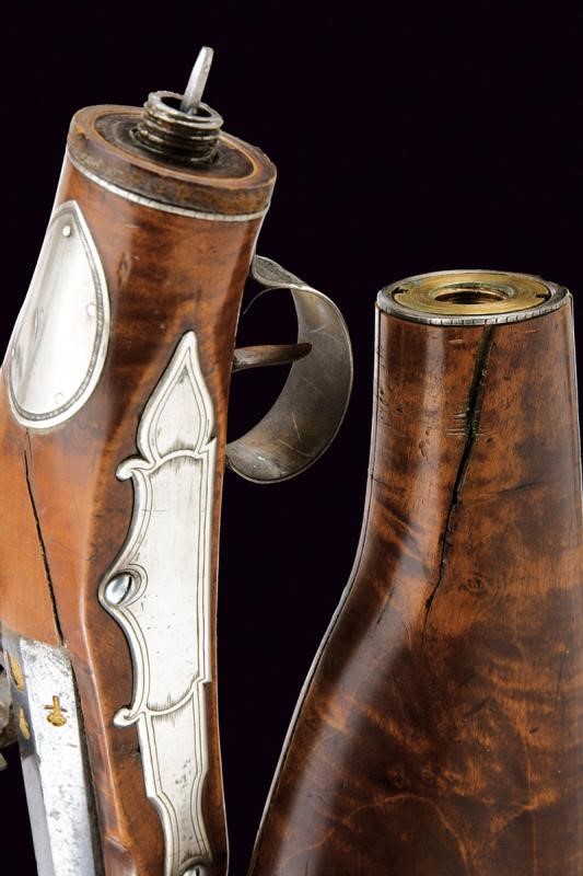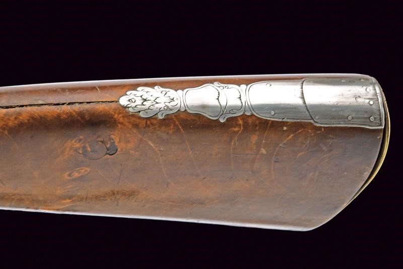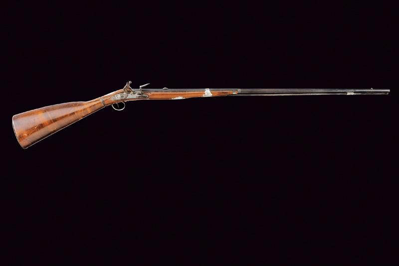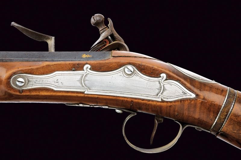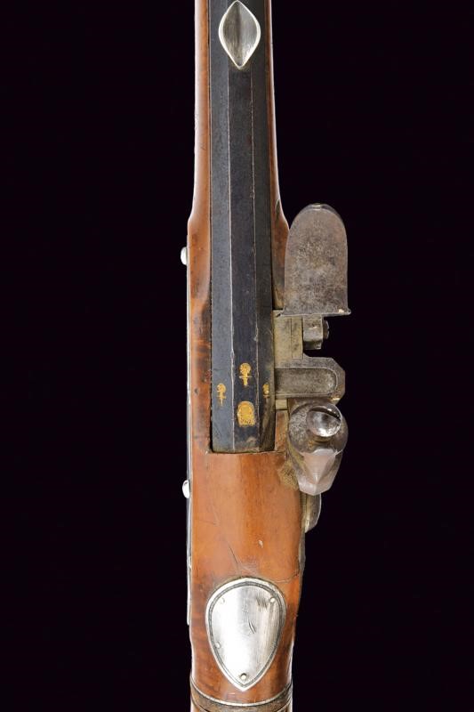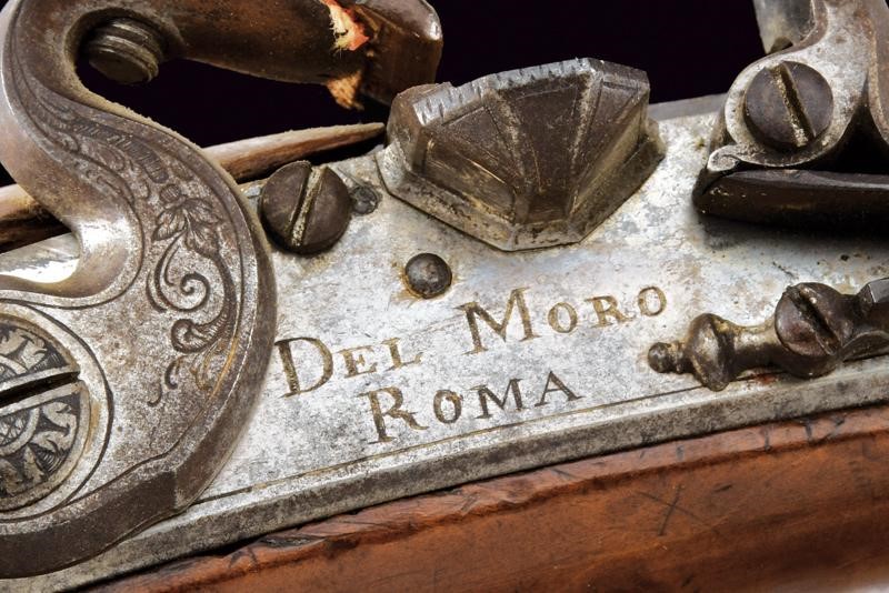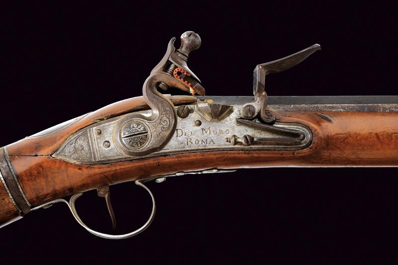 Lunga canna liscia a due ordini, prima ottagonale, con marca "ROMA" rimessa in oro tra tre fiori, dotata di traguardo a sella in argento, poi con anellatura al cambio e di sezione tonda, dotata di mirino, cal. 11 mm. Batteria a pietra focaia firmata "Del Moro Roma" con coda ribassata ed incisa a decorazioni floreali. Mezza cassa in legno (alcune crepe e restauri). Il calcio svitabile, contenente il serbatoio d'aria. Fornimenti in argento (con patina scura). Bacchetta con battipalla in corno e cavastracci in ferro con base in ottone.