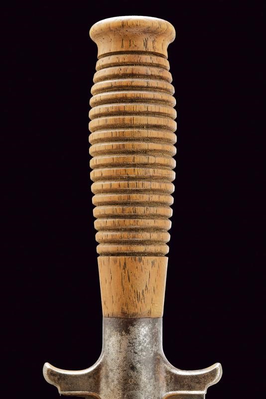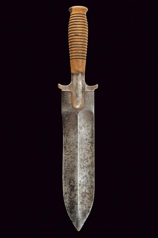 Lama dritta a un filo, costolata in mezzeria e con sguscio situato nella parte dorsale; guardia in ferro, corte alette dotate di teste rivolte verso il manico, la parte centrale marcata "U.S SPRINGFIELD" e numerata "23". Impugnatura in legno con scanalature circolari trasversali. la sommità a disco.