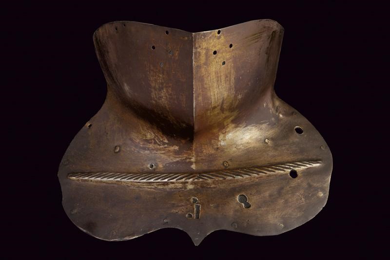 In ferro, costolato in mezzeria con sforature tonde, ampio collaretto con risalto cordonato per l'alloggiamento sopra lo scollo del petto, margine inferiore a graffa, fori di fissaggio sul lato sinistro e spacco rettangolare al centro per la chiavarda. All'interno è ribadita una placca di rinforzo. In patina.