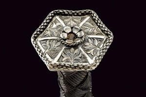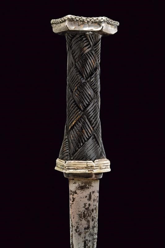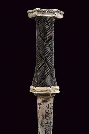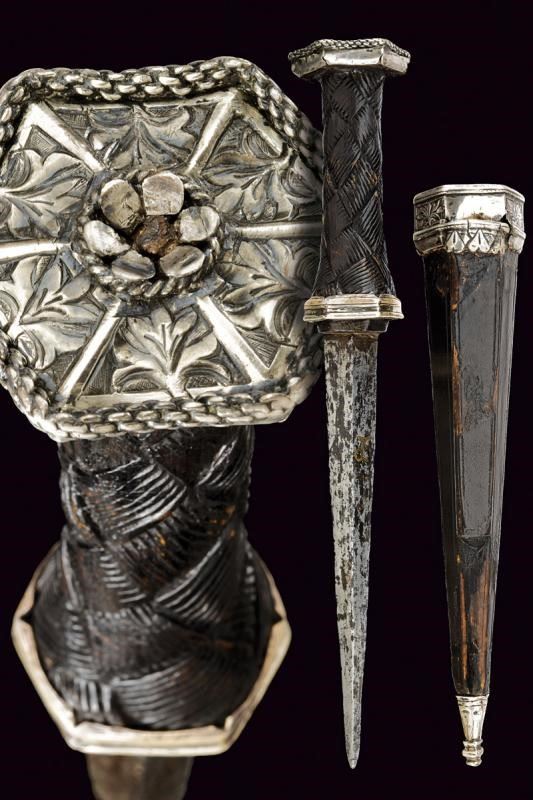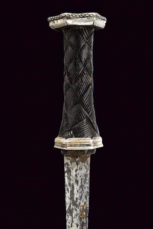 Robusta lama dritta di sezione triangolare a facce piane, una recante marca rimessa in ottone (danni da ruggine). Impugnatura cilindrica in ebano, avente sezione ingrossata alla base inferiore, scolpita ad imitare la trecciola; bel pomo in argento di forma esagonale con bordo lavorato a catena, al centro un fiore e ognuno dei sei settori recante incisioni a motivi floreali; la ghiera sempre in argento e di forma esagonale, decorata con bande. Completo del suo fodero in legno rivestito in cuoio (mancanze) con fornimenti in argento; la cappa presenta alcuni difetti, è incisa en suite al pomo e presenta un passante a staffa; il puntale di forma troncoconica faccettata con base a balaustro; l'imboccatura e l'interno del fodero con resti di velluto rosso. Su un lato scompartimento per coltello, ora mancante.