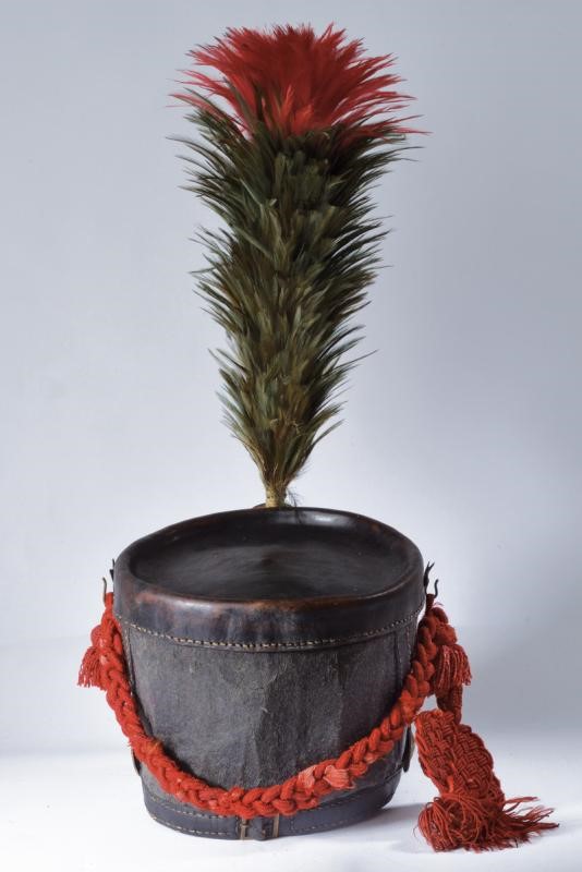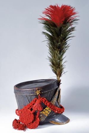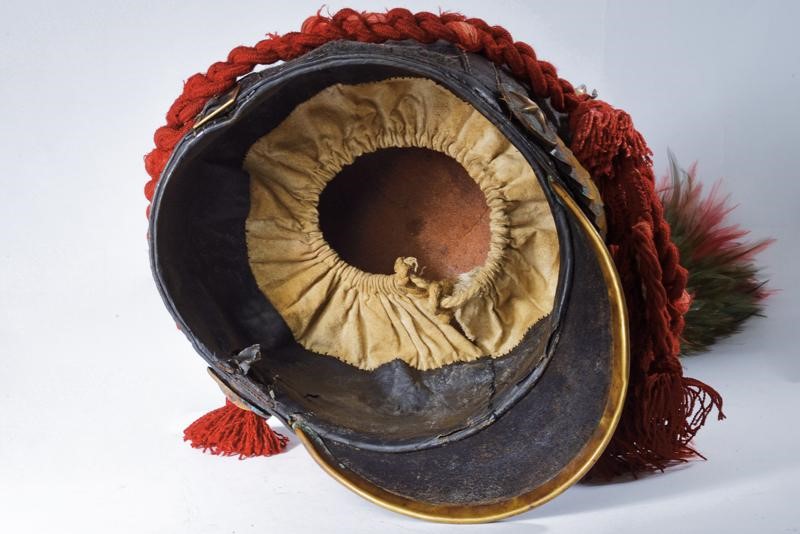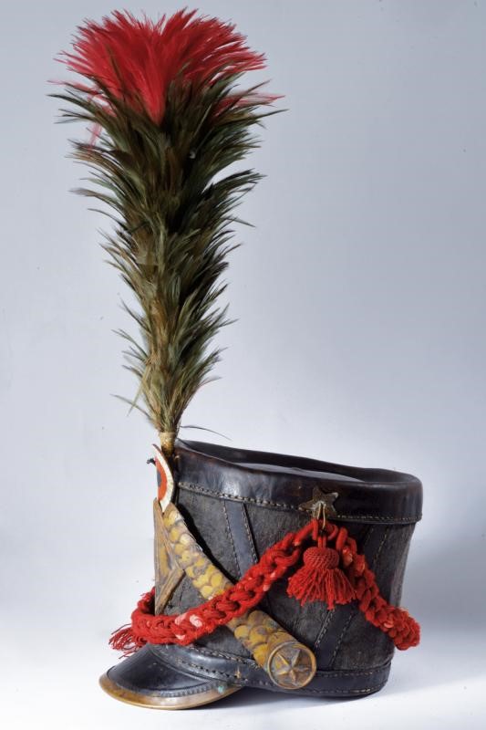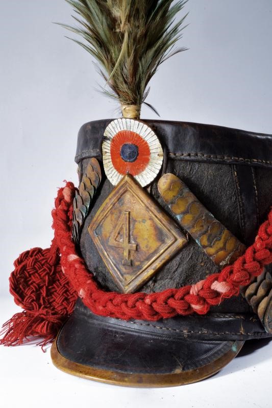 Fusto in spesso feltro, rinforzato ai lati da due Chevron in cuoio e chiuso da uno spesso imperiale, anche questo in cuoio. Fregio romboidale pre-1812 caricato del numero "4", alla sommità coccarda in cuoio nei colori nazionali; soggoli in metallo giallo fermati da una borchia con stella a quattordici scaglie. Alla sommità un grosso pennacchio verde con testa rossa (lunghezza 36 cm). Racchette, fiocchi e cordone in tessuto di lana tubolare di color rosso. Visiera in cuoio con impressione stampata e bordata con semicerchio in ottone. L'interno con ampia fascia di pelle (danni) che continua in una cuffia di tela cruda. Interessante.