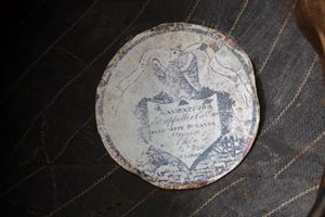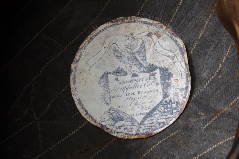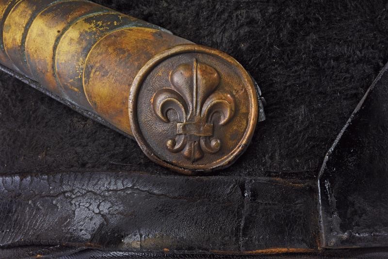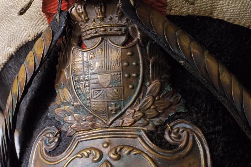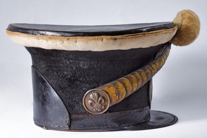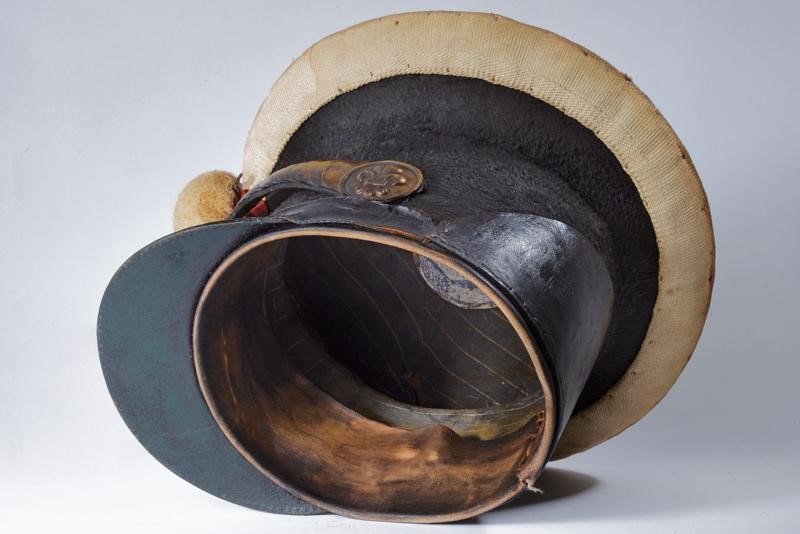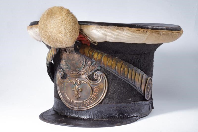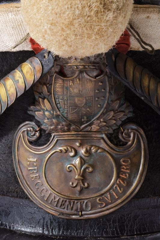 Struttura rigida in spesso cartone foderato esternamente in feltro castorato; al frontale significativo fregio in ottone del 1° Reggimento Svizzero. Sottogola a sedici squame in ottone tenute da una borchia recante giglio. Imperiale in robusto cuoio con pom pom bianco semisferico su coccarda rossa in tessuto; coprinuva in cuoio gallone in cotone. Visiera semi curva in cuoio con bordo imperiale, la parte interna verniciata in verde. All'interno ampia alluda in pelle, fusto foderato in tela a righe e con un'etichetta.