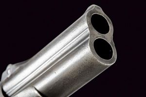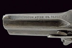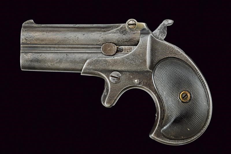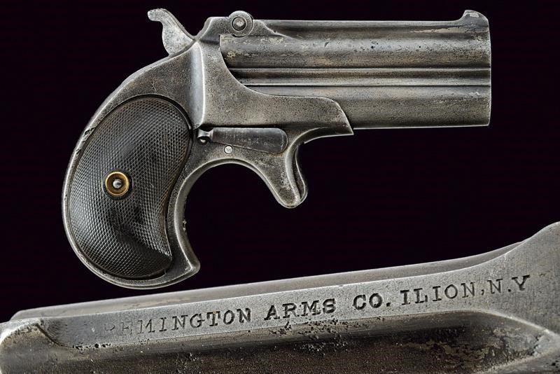 Canne sovrapposte con bindella dorsale marcata "REMINGTON ARMS CO. ILION N.Y." Cal. 41 rimfire short. Anime con rigatura visibile, intaccature all'interno. Apertura con basculamento verso l'alto (forse una riparazione ad una delle due briglie). Estrattore manuale sul fianco sinistro. Grilletto a sprone. Guancette in gommadura zigrinata. Meccanica funzionante, ma talvolta il percussore non si solleva, abbattendosi sulla stessa culatta più volte. Intaccature.