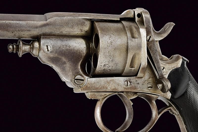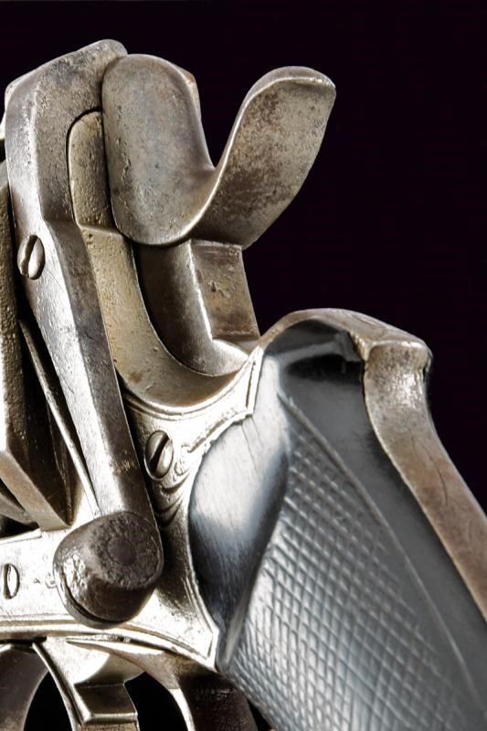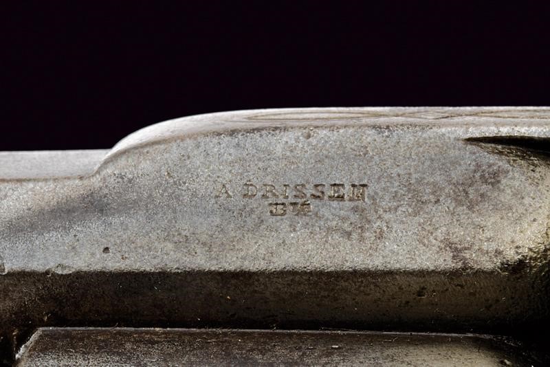 Canna rigata, ottagonale, marcata alla base "A. DRISSEN B.." e con resti della dicitura "ACIER F...", dotata di mirino, cal. 11 mm. Tamburo lievemente inciso volute, a sei colpi. Castello con matricola "12xx" (il numero 1 non in linea con gli altri tre). Sul lato sinistro leva d'apertura per il caricamento, estrattore automatico. Guancette in legno zigrinato. Anello di sospensione. Raro.
