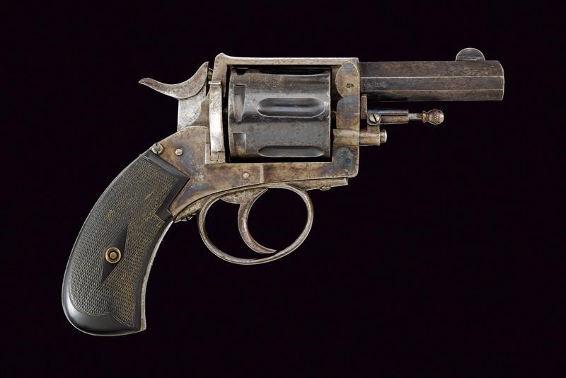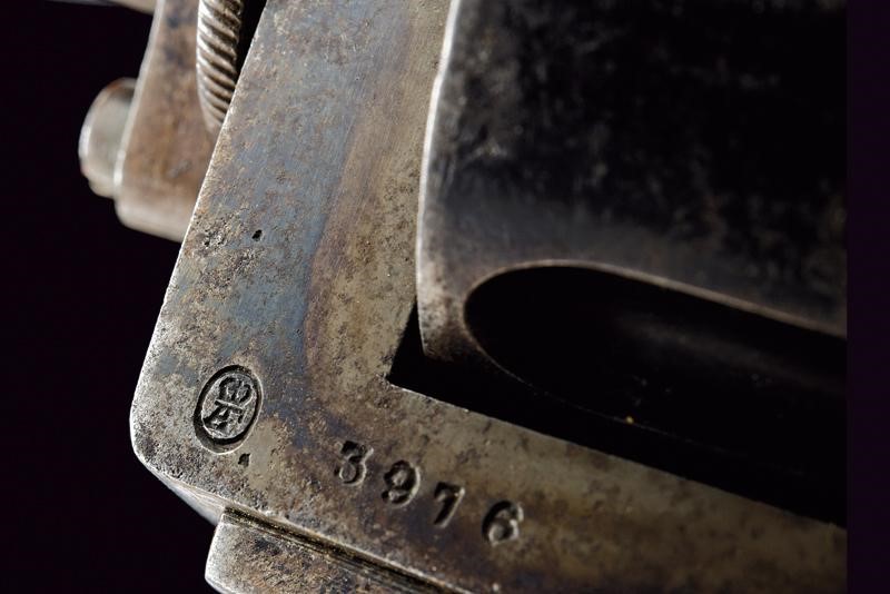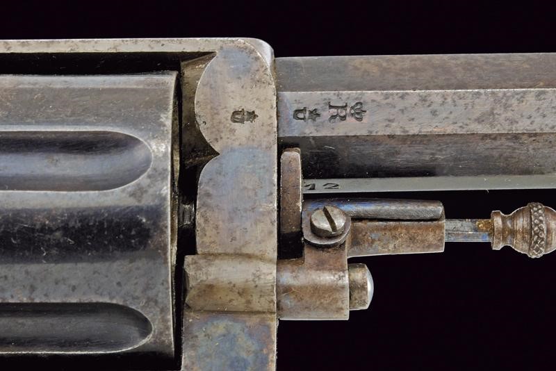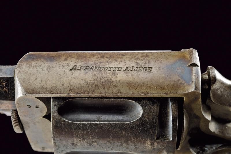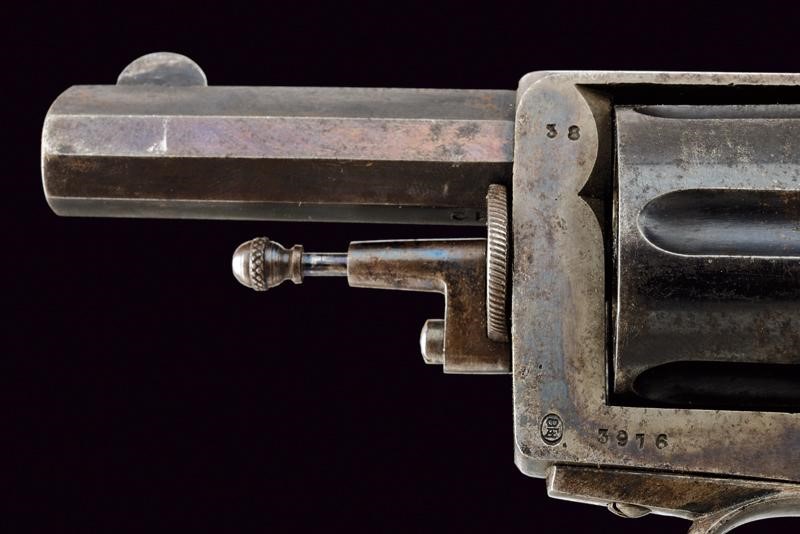 Canna ottagonale rigata (rigatura visibile, anima pulita); mirino a mezzaluna, cal. 380. Tamburo a sei colpi con punzoni del banco di Liegi, "L" coronato e "U" stellato. Castello con resti di tartarugatura probabilmente antica, marcato "38", matricola, monogramma "AF" e "U" stellato. Guancette in ebano zigrinato. Meccanica ben funzionante in singola e doppia azione. Canna e tamburo conservano il 70% della brunitura antica.