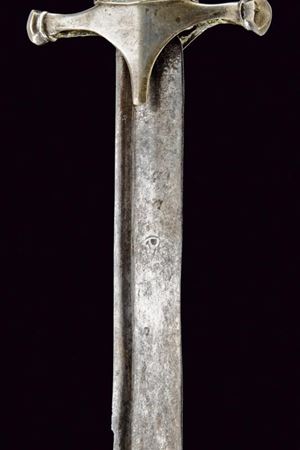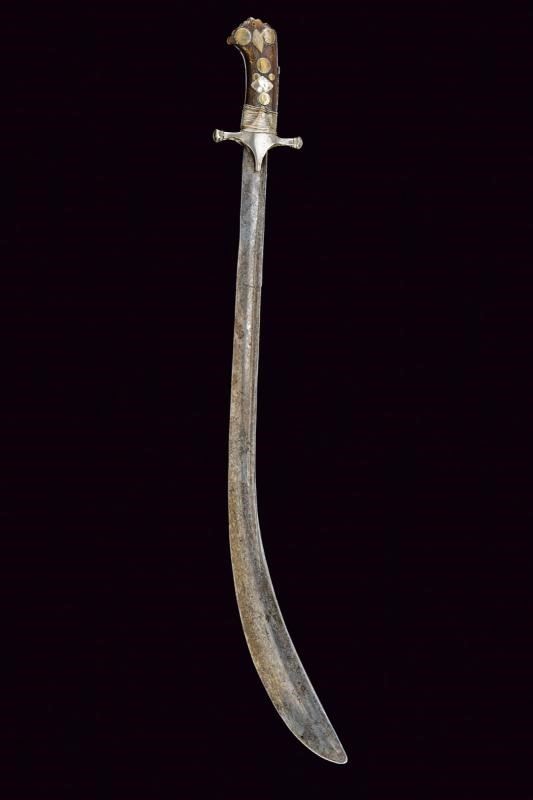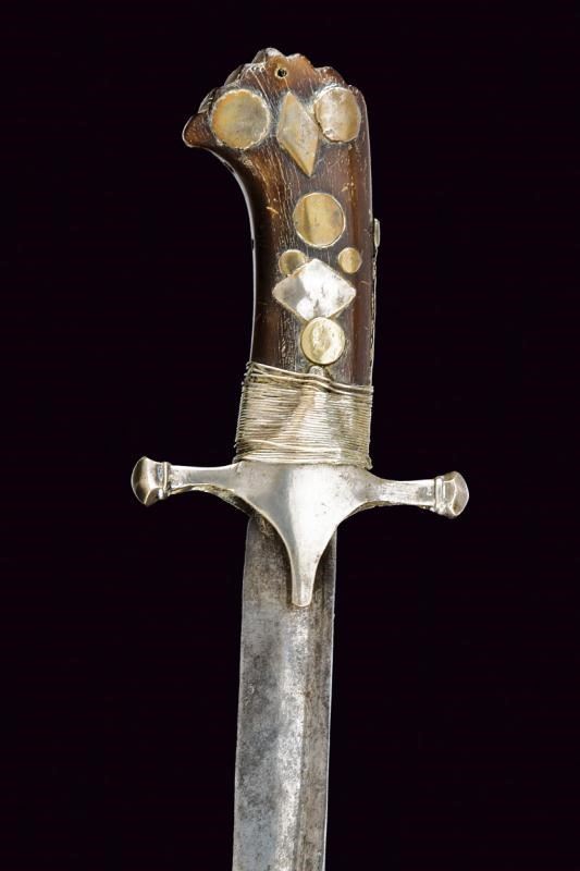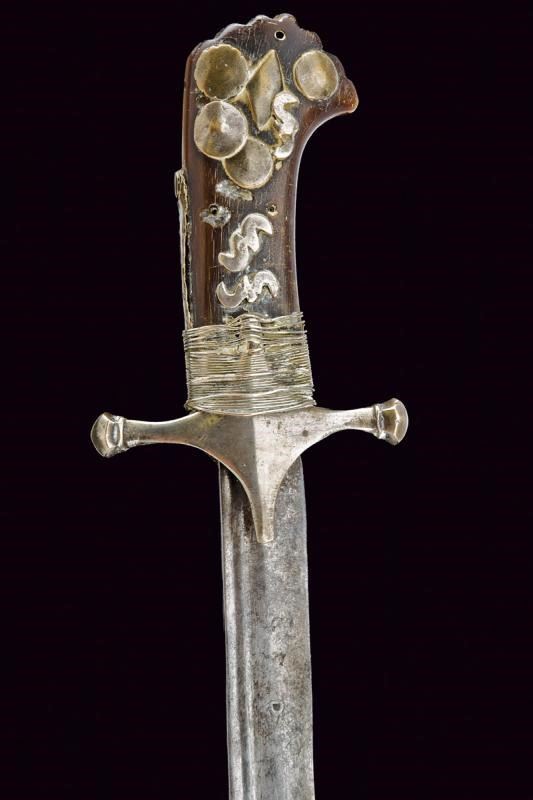 Interessante lama, dritta nella prima parte, con dorso a "T" e con resti di punzone alle base, nell'ultimo terzo incurvata, allargata e a due fili. Impugnatura in corno con pomo simile a quello delle karabela, elso a croce e fornimenti in argento (piccole mancanze).