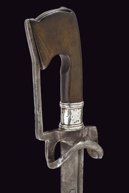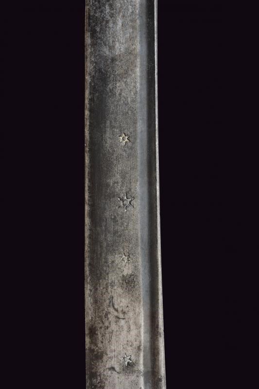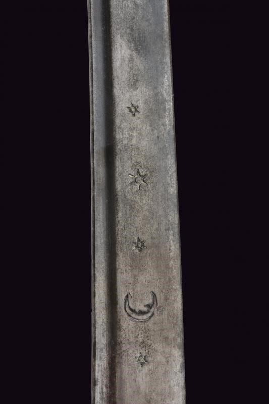 Lama curva,a un filo e controfilo con sgusciatura dorsale, recante stelle e mezzaluna alla base. Fornimento in ferro con pseudo ponticello girato verso l'impugnatura e con guardia. Tipica impugnatura in legno leggermente incurvata e ingrossata al sommo.