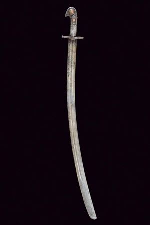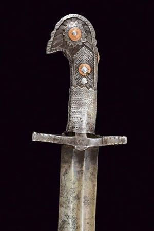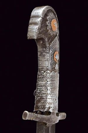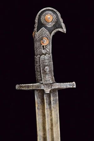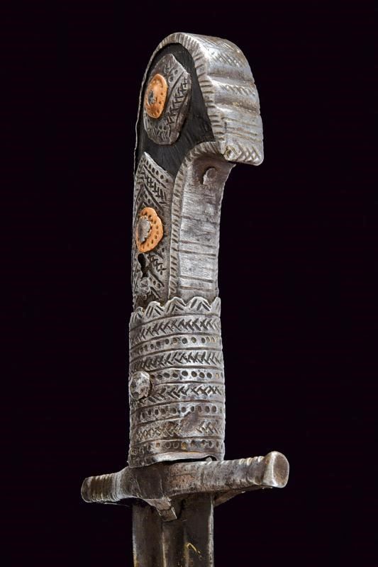 Lama leggermente curva con due scanalature che diventano tre in seguito; la punta arrotondata. Impugnatura in legno con fornimenti in ferro incisi a motivi geometrici; il pomo a testa di uccello stilizzata.
