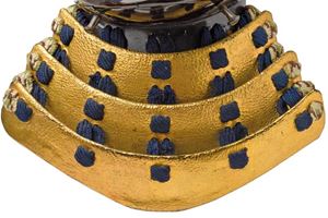 Struttura rigida in nerikawa. L'esterno rivestito in lacca bruna lucida. L'interno in lacca rossa (con crepe). Tare (suga) a tre lame in ferro, rivestite in cuoio laccato oro all'esterno e marrone-bruno all'interno. Allacciatura stile sugake color blu. Takuboku Mimi-ito sui due lati.