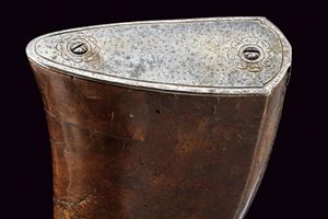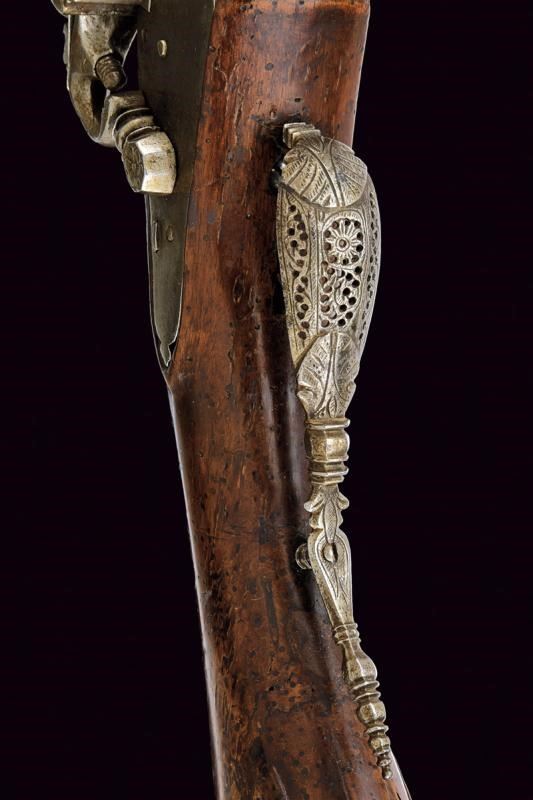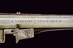 Canna liscia a due ordini, prima ottagonale, con modanatura in culatta, marcatura "LAZARINO COMINAZZO", anellatura al cambio, e con secondo tratto a sfaccettature longitudinali; dotata di piccola gioia di bocca. Cal. 17,2 mm. in volata. Batteria a pietra focaia del tipo arcaico, con piastra ancora foggiata per le batterie a ruota. Il cane breve, con piede recante intaglio floreale, spesso nodo e collo arcuato. Meccanica funzionante ma il grilletto ha difficoltà ad agganciare la stanghetta dello scatto. Cassa intera in legno di produzione antica. La pala con svariati fori di tarlo (restaurati, non attivi), con due tasselli rimpiazzati adiacenti al calciolo e una frattura restaurata. Fornimenti in ferro. Bel ponticello decorato a nodi e con traforo floreale. Calciolo antico in ferro con delineatura e incisioni floreali. Bacchetta di produzione non recente, dotata di battipalla tornito in ferro e di cavastracci.
