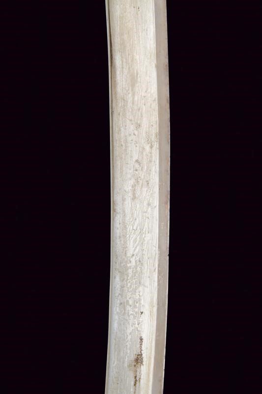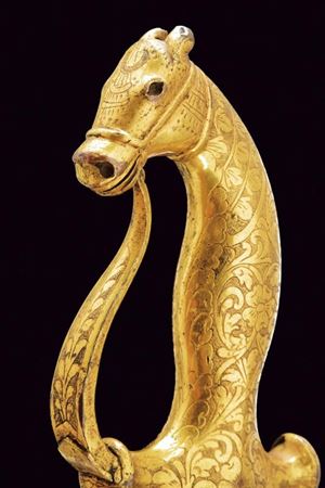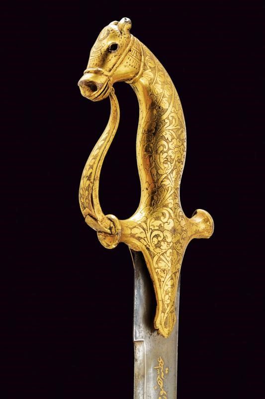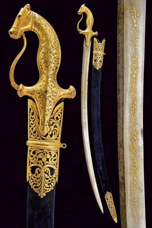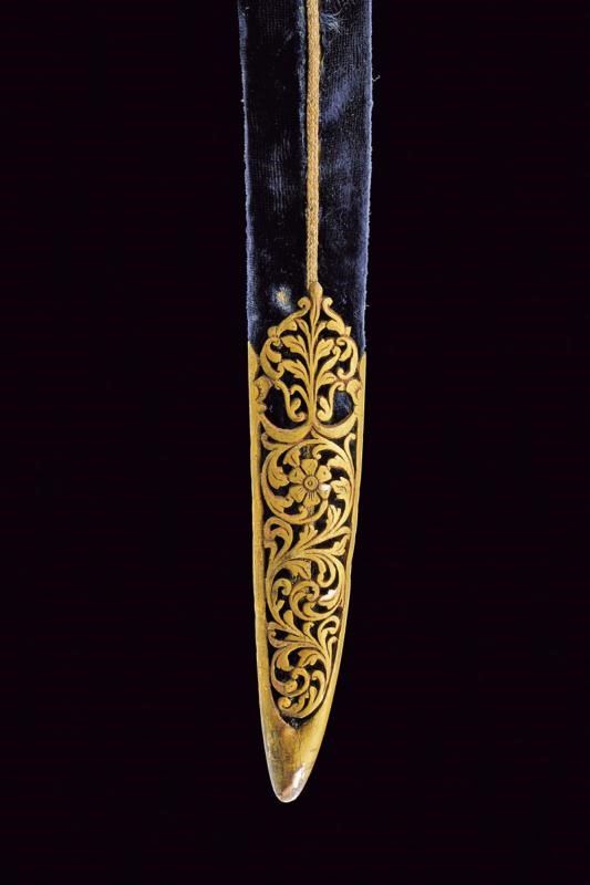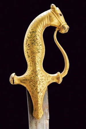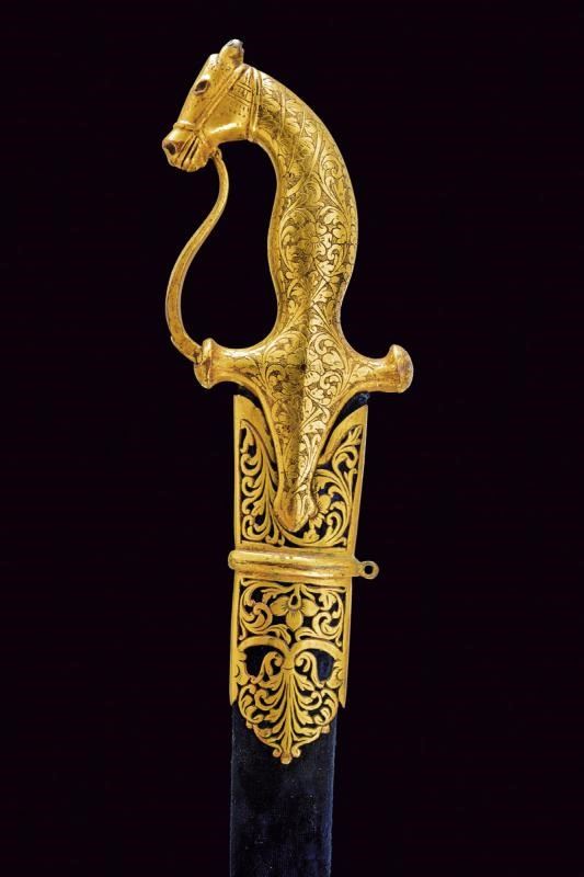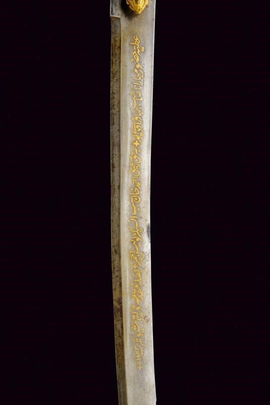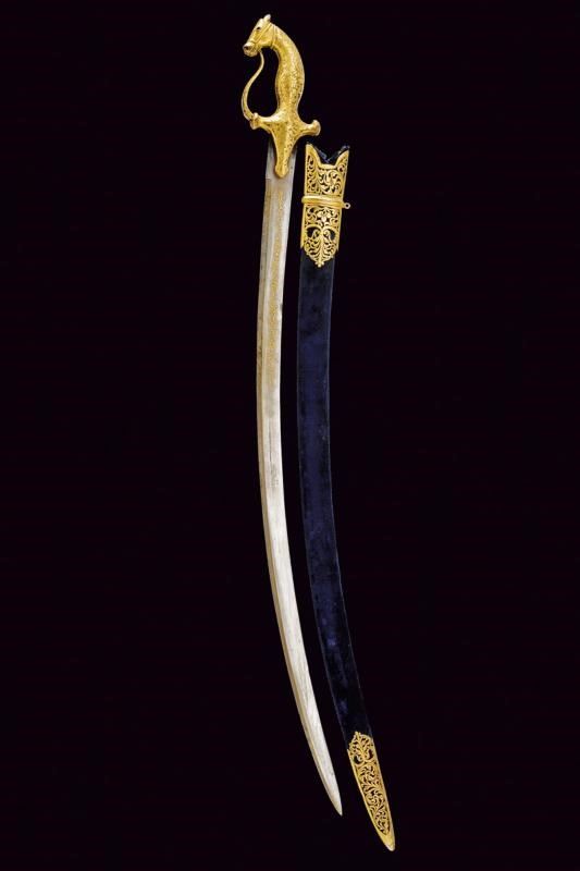 Robusta lama curva a filo, (in damasco?), recante su un lato iscrizioni in caratteri dorati. Bel fornimento in un unico pezzo con l'impugnatura, in metallo non ferroso e completamente dorato, dotato di lunghe alette fermafodero e bracci dell'elso a torre; tutta la superficie incisa a motivi fitomorfi; il pomo lavorato a testa di cavallo. Fodero in legno rivesto con velluto blu, fornimenti in metallo dorato, traforati ed incisi a motivi floreali.