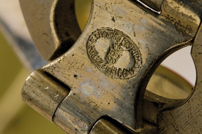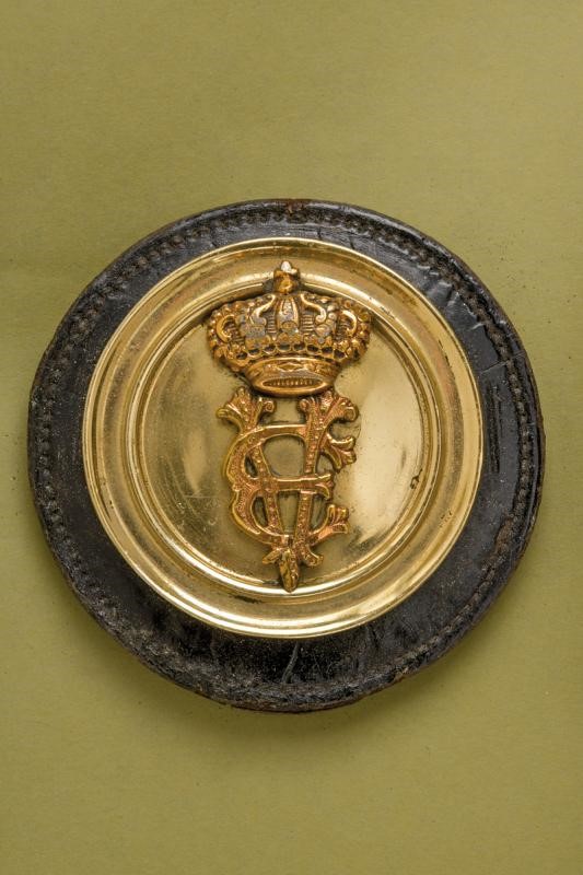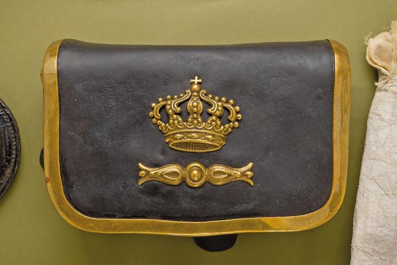 Lotto composto da giberna e bandoliera. La prima con struttura in ferro rivestita di cuoio, l'interno con tre scomparti, il coperchio in cuoio con bordi in ottone, recante al centro stemma effigiante corona, chiusura tramite bottone in ottone. La bandoliera in cuoio bianco con fornimenti in ottone, due placche applicate su base in tessuto rosso, una a forma di corona, l'altra a scudetto caricata con le cifre "VE" in metallo bianco. Insieme anche pantaloni e crespini in cuoio bianco, paio di sproni in alpacca, uno con punzone di Capriolo. Colletto per mantella, in tessuto rosso e con decori in canutiglia argentata caricata da stella. Infine completa l'insieme il raro rosone da cavallo, con base in cuoio e stemma circolare con cifre "VE" coronate, in metallo dorato.