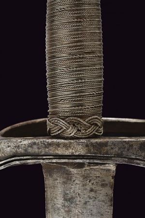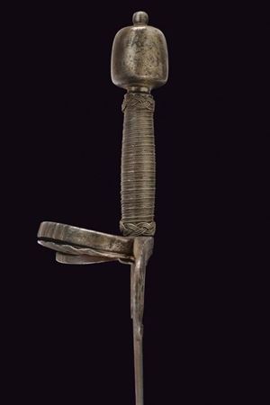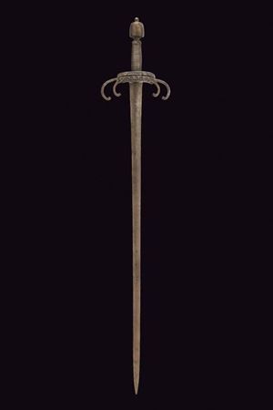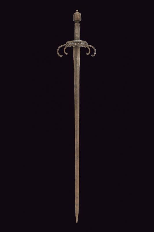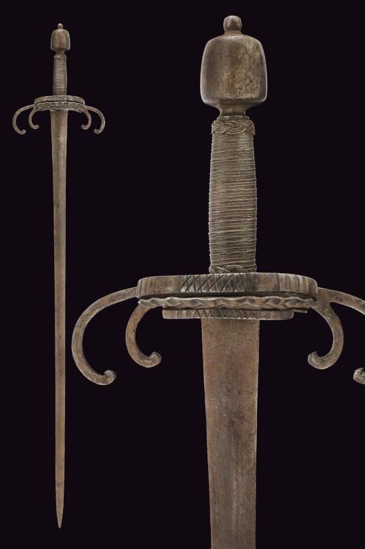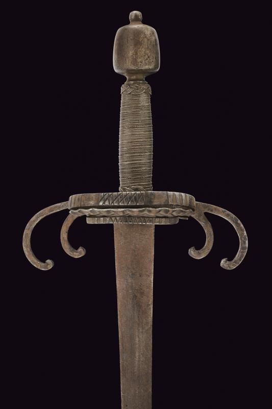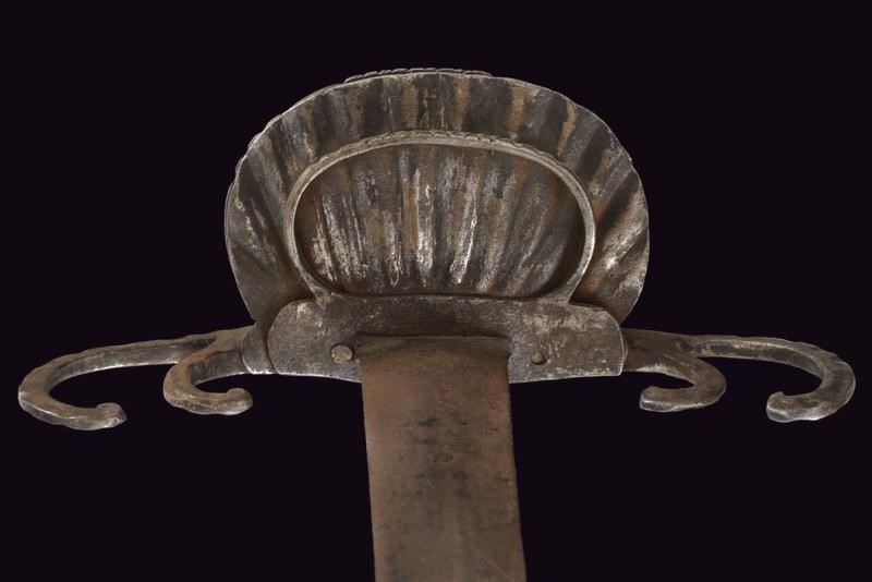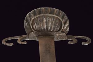 Lama di sezione lenticolare (alcune intaccature, il lato di terza con ruggine superficiale). Fornimento in ferro con due anelli intagliati a linee oblique e con bande longitudinali ai lati, fra questi la coccia, dotata di sgusciature a raggi. Tipici doppi rami dell'elso incurvati verso la lama decorati con brevi sgusci. Pomo troncoconico liscio e bottonato. Impugnatura in legno con trecciola e teste di moro in filo di ferro.