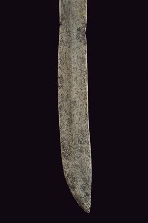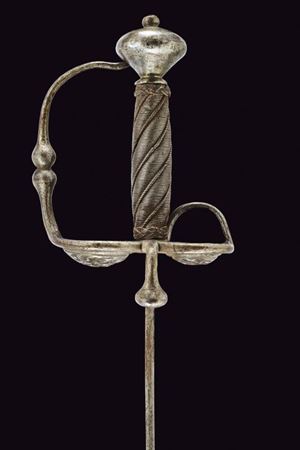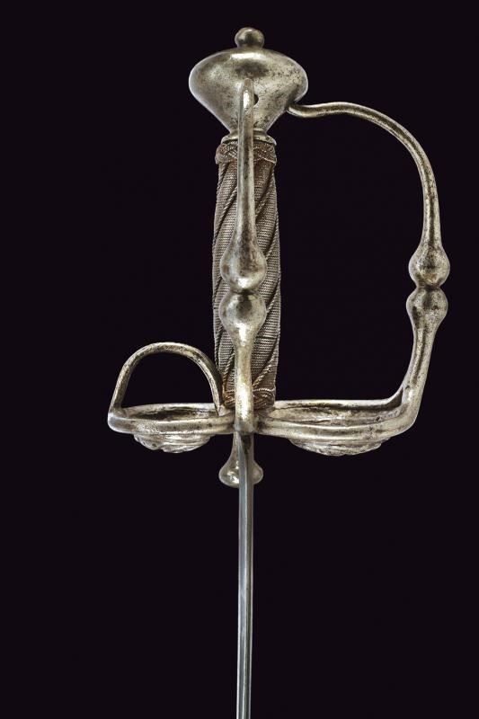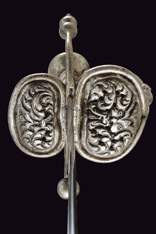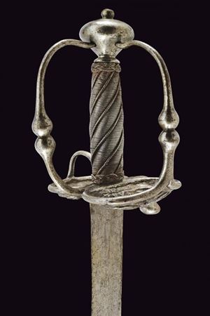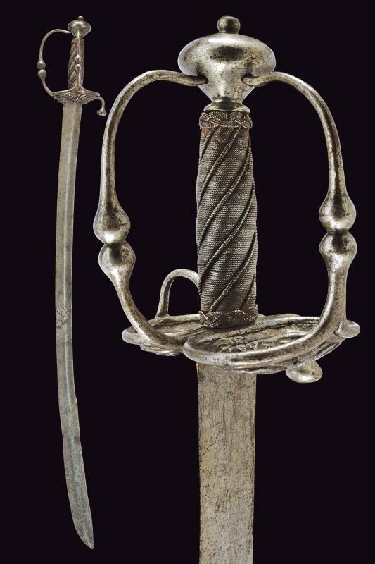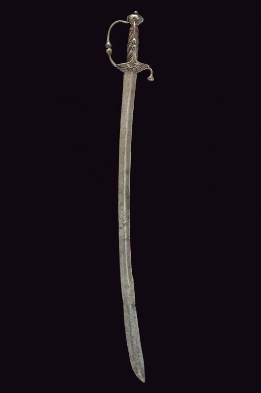 Larga lama curva a un filo e controfilo, con sgusciatura dorsale; dall'attacco del controfilo leggermente allargata. Tipico fornimento in ferro con due valve ben intagliate e parzialmente traforate a volute, quella sul lato di terza anche con mascherone; braccio di parata angolato e con testa ingrossata; la guardia con rami decorati a nodi, anello di presa; pomo a fico con struttura esterna liscia, bottonata. Bella impugnatura in legno rivestita di trecciola e con teste di moro in filo di ferro.