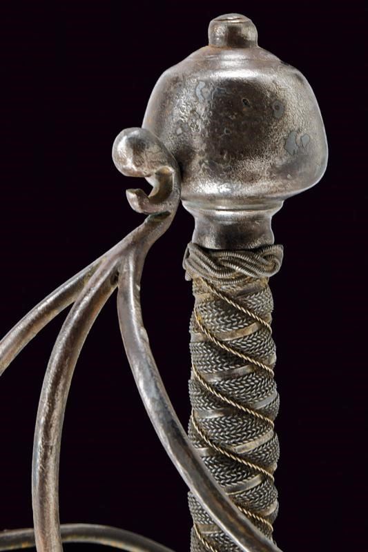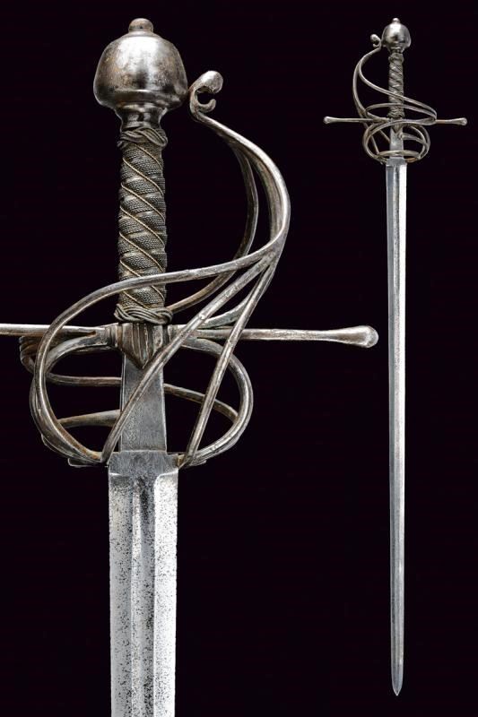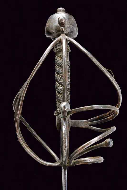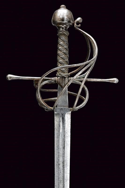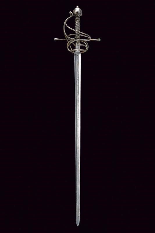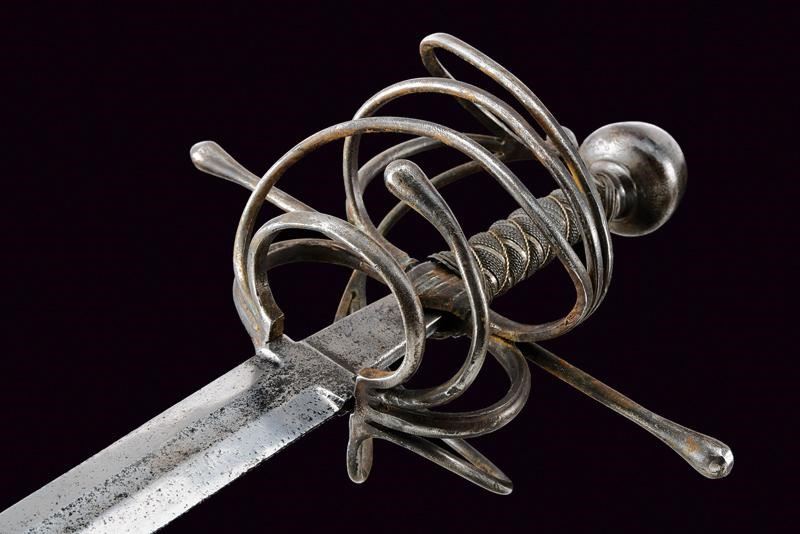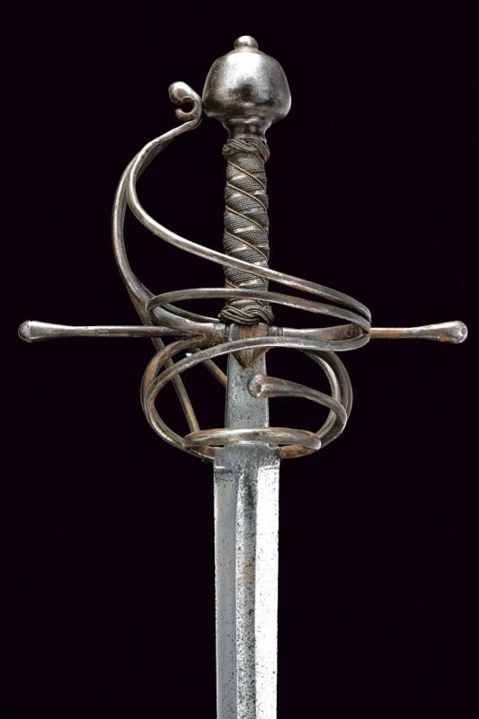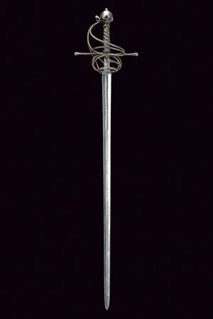 Lama dritta d sezione esagonale a due fili, con sguscio centrale al forte; ricasso di sezione rettangolare. Fornimento in ferro, un arresto e ponticello; bracci dell'elso dritti con teste ingrossate; massello appuntito e recante triplice scanalatura; guardia con estremità a ricciolo, contro-guardia a tre rami. Pomo (XIX secolo?) di forma sferoide schiacciata. Rocchetto con trecciola, bande e teste di moro in filo di ferro.