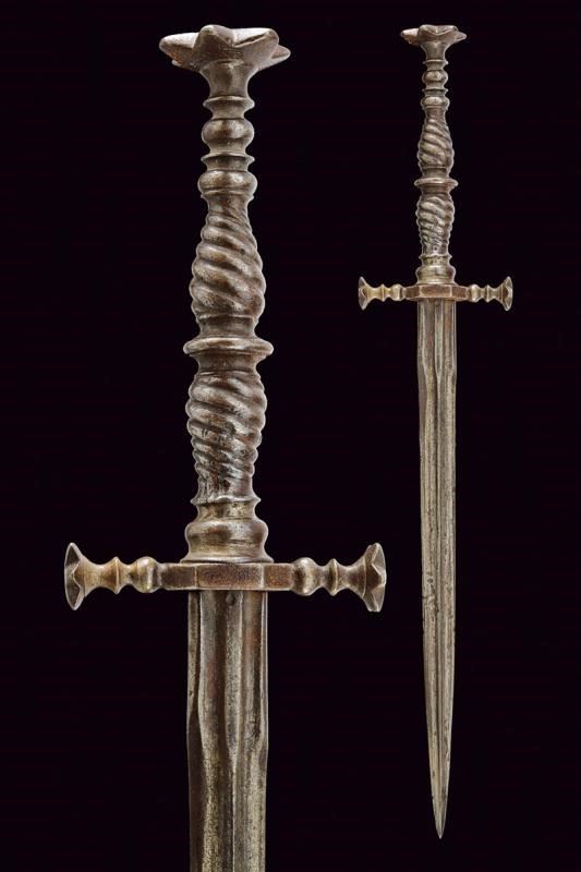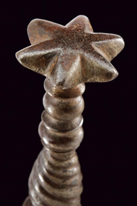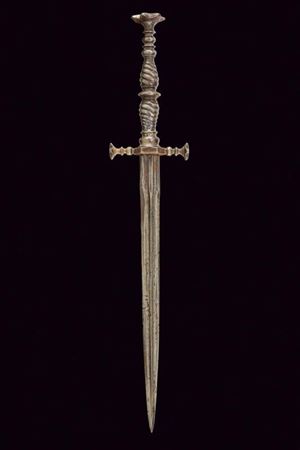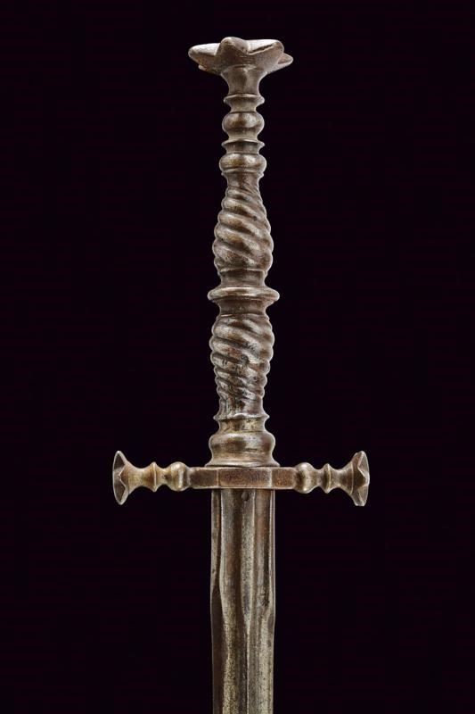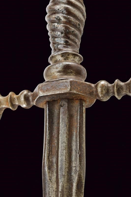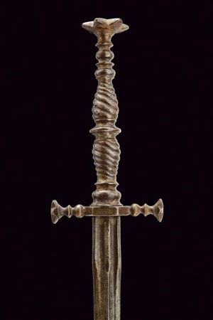 Lama dritta a due fili con forte nervatura centrale, Il tallone con doppia scanalatura. Fornimento in ferro, bracci dell'elso e pomo con estremità a stella. Impugnatura a balaustro.
