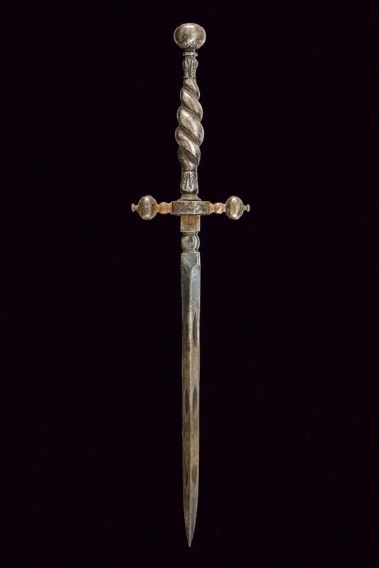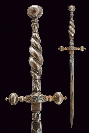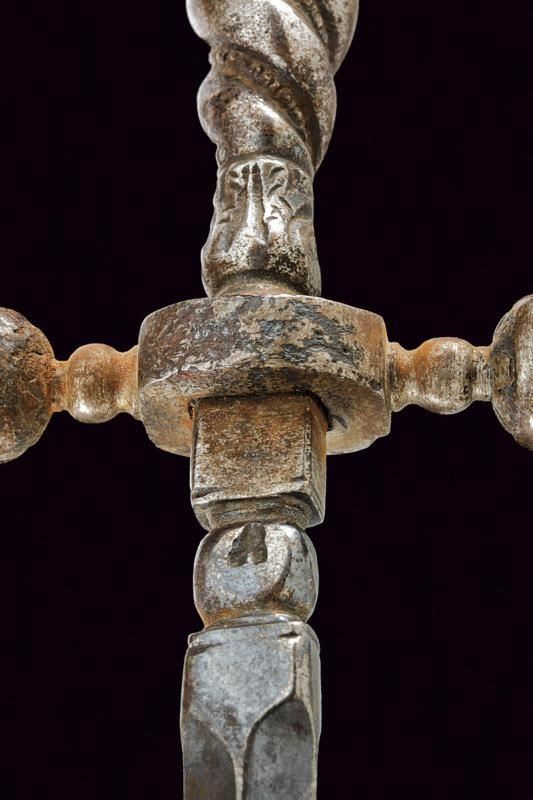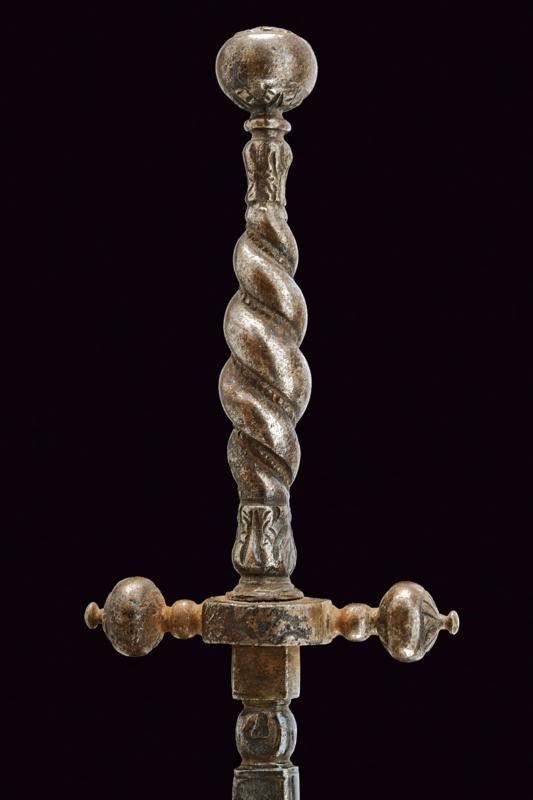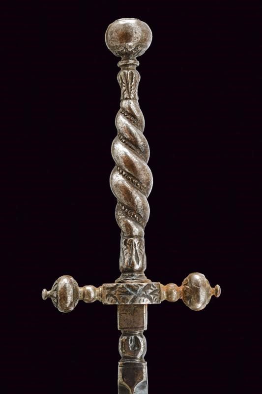 Lama dritta di sezione a losanga, la base con nodo con marca poco leggibile e tallone. Fornimento in ferro intagliato a motivi floreali, le estremità dei bracci ed il pomo di forma sferoide schiacciata. Impugnatura a spire con intagli a perline per fingere la trecciola.