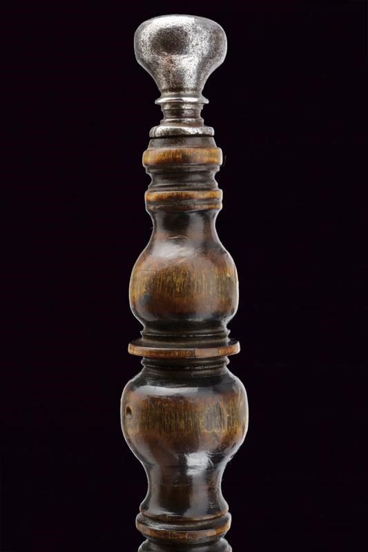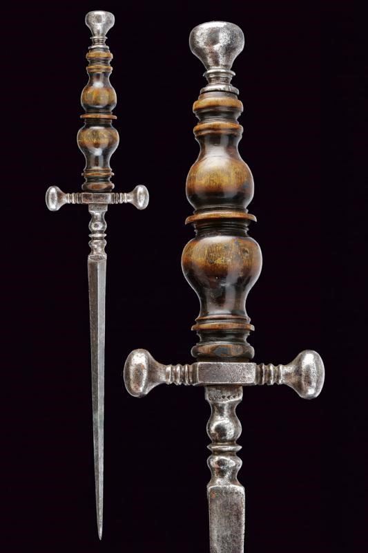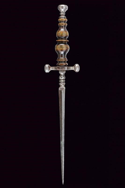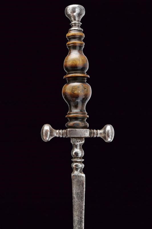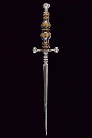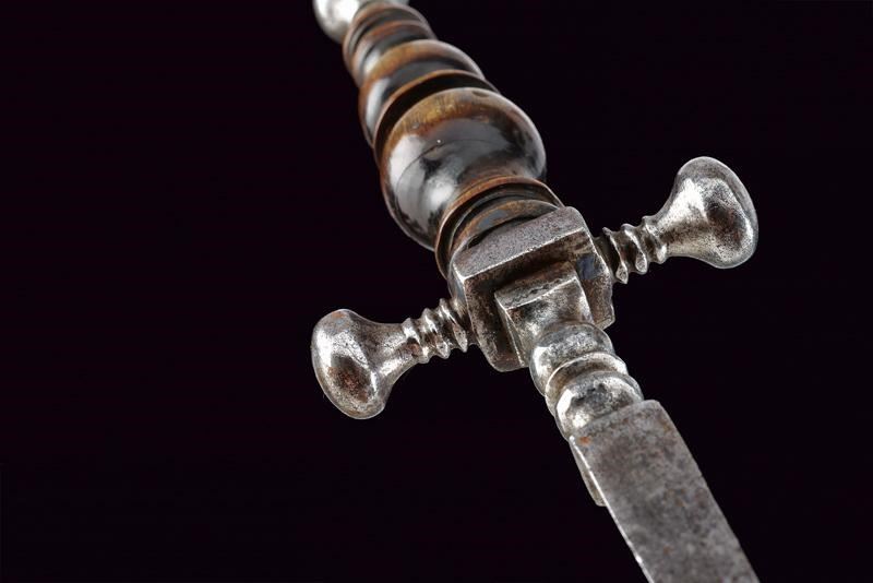 Lama dritta di sezione triangolare, decorata alla base con un disegno a puntini; doppi nodi suddivisi da un disco. Elso a bracci corti con estremità lenticolari. Pomo lavorato en suite. Bella impugnatura in corno finemente scolpita a balaustro.