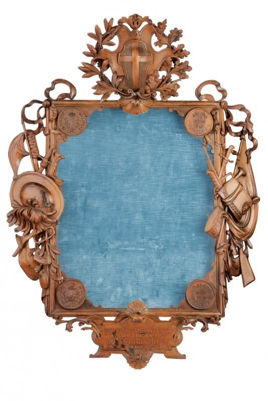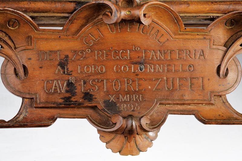 Cornice in legno scolpito, di forma rettangolare, con superfice centrale foderata di velluto celeste e dotata vetro. Agli angoli del lato sinistro raffigurazione di due medaglie al valor militare, sul lato opposto medaglioni con iscrizioni "ANCONA 29 SET.RE 1860" e "MOLA DI GAETA 4 NOV.RE 1860". La sommità con stemma sabaudo fra fronde di quercia e alloro, la parte sinistra con moretto da bersagliere, baionetta 91, daga da genio, tromba, lancia ed utensili da caccia; al lato opposto un kepi da cavalleria, fucile e baionetta 91, tamburo e tromba; nel lato corto inferiore con dedica "GLI UFFICIALI DEL 72° REGGI.TO FANTERIA AL LORO COLONELLO CAV. RE ESTORE ZUFFI XMBRE 1895".