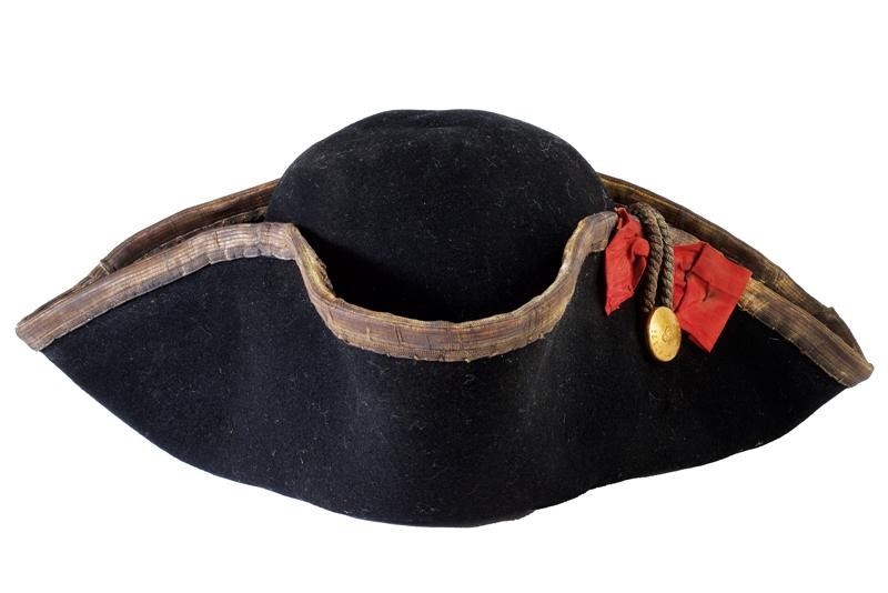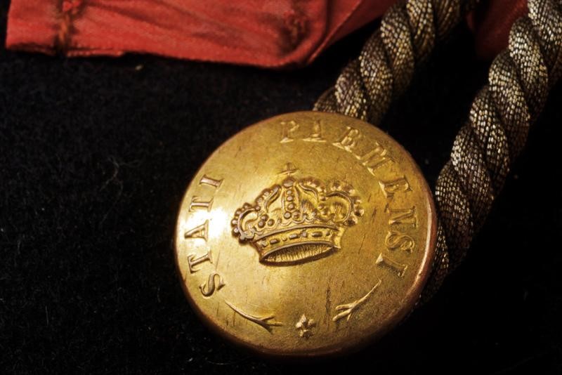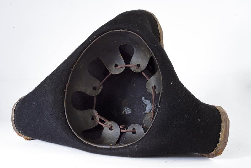 In feltro nero, strutturato a tre punte, bordato di gallone metallico per un ufficiale. Sul lato sinistro coccarda "fiocco" rosso trattenuta da laccio in cordoncino metallico con bottone recante la scritta "Stati Parmensi". Cervelliera in gallone metallico operato. L'interno con cuffia a denti di lupo, fodera mancante.