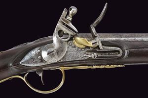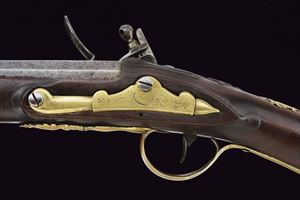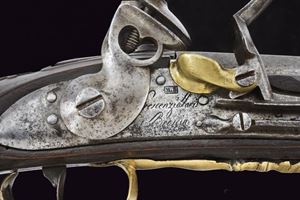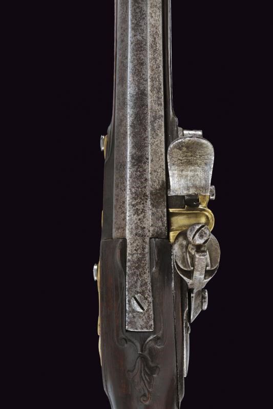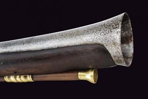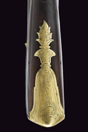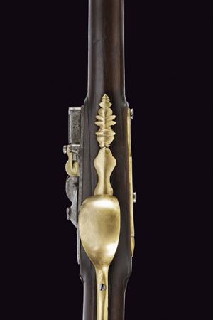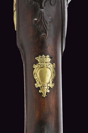 Canna in ferro a due ordini, prima di sezione ottagonale, poi tonda, con anellature al cambio e volata munita di forte strombatura circolare. Batteria a pietra di assetto militare, con scodellino in ottone, cartella recante punzone "M.B." entro un rettangolo e firma "Crescezio Paris / Brescia". Meccanica funzionante. Cassa intera in legno con riparazioni alla pala ed altri difetti, recante al dorso intaglio floreale e traguardo a sella. Fornimenti in ottone. Il calciolo e contropiastra incisi en suite a rocaille. Il ponticello liscio. Sul collo uno scudetto privo di cifre, sormontato da corona ducale. Bacchetta in legno con battipalla in ottone e cavastracci in ferro.