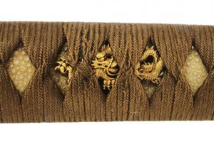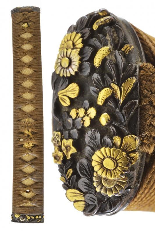 Completa di samegawa, tsuka-ito, fuchi-kashira in shakudo con decorazioni floreali e menuki a forma di drago. Periodo fine Edo.