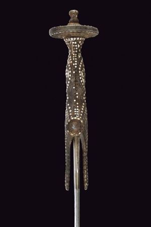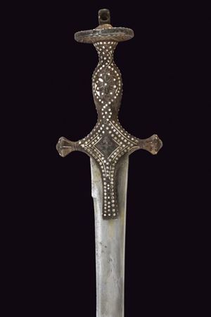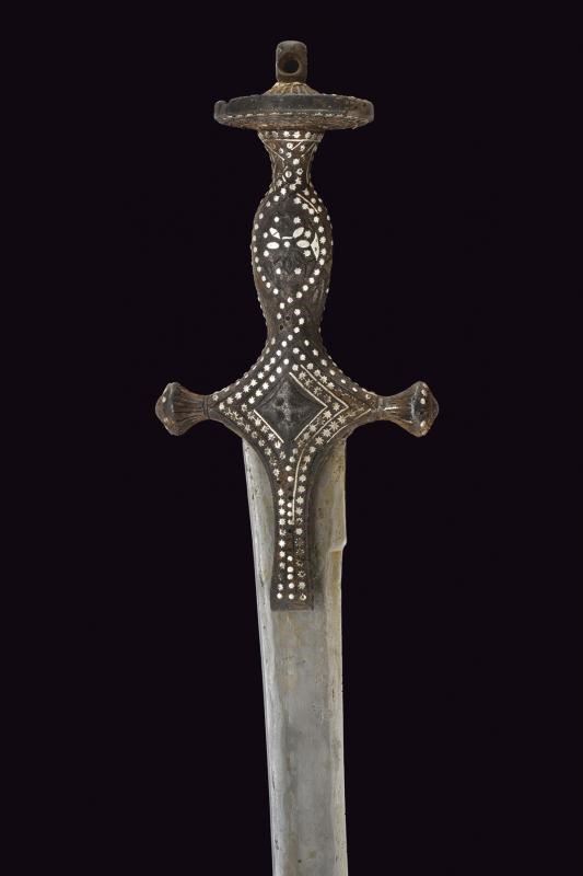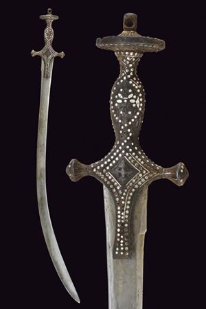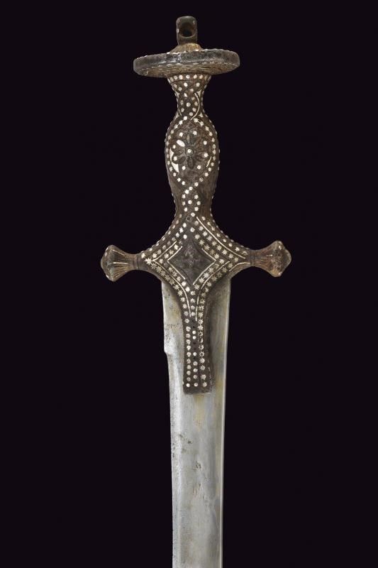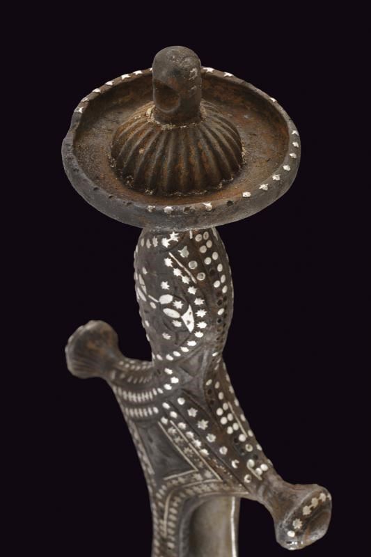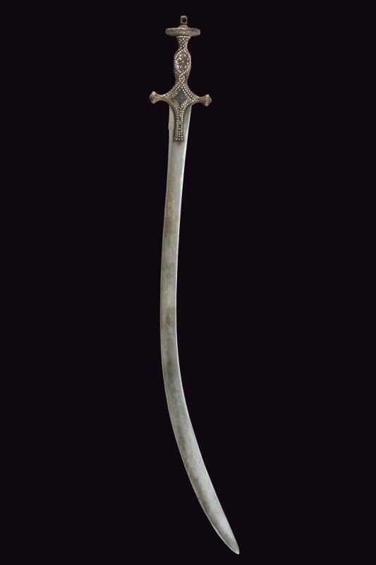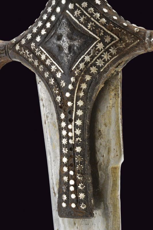 Lama curva a un filo e controfilo in damasco, con tallone. Fornimento di tipica foggia, in ferro, decorato a stelline e a motivi floreali rimessi in argento (mancanze).