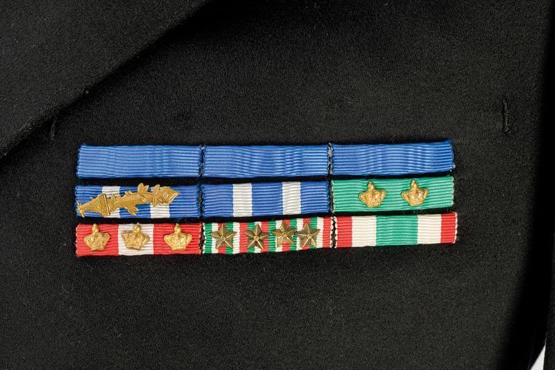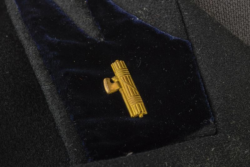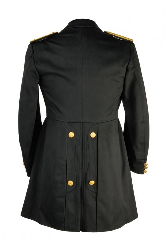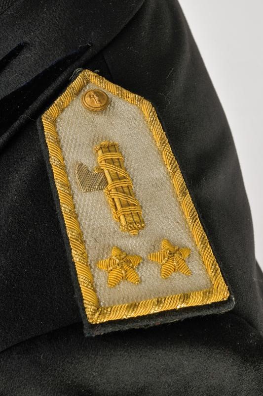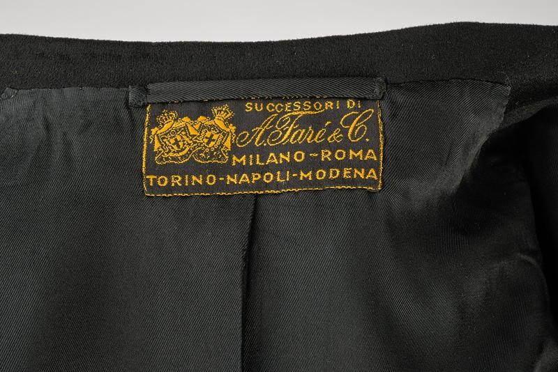Confezionata in castorino di lana nero. Fiamme al collo in velluto di seta caricate da fascio littorio; al petto nastrini di campagna, controspalline non pertinenti da funzionario del PNF, pantalone con banda di seta e filettatura dorata di 5 mm per ufficiali generali.